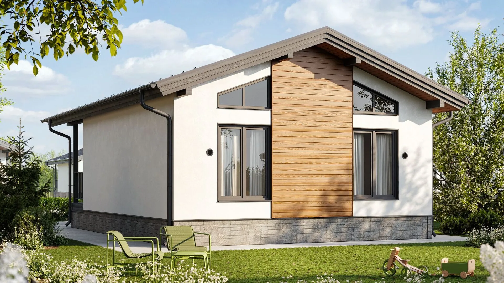 Светлая, просторная и уютная — ваша будущая загородная резиденция «МОНЕ 54‑ШТ+ИБ» приглашает откровенно отдохнуть от городского шума и окунуться в спокойствие природы. Одноэтажный дом в скандинавском стиле, выполненный из современных каркасно‑панельных конструкций, гармонично вписывается в ландшафт, не нарушая его естественную красоту. Благодаря продуманной теплоизоляции и высококачественному материалу, этот дом подходит для круглогодичного проживания: каждый уголок будет комфортно обогреваться зимой и оставаться прохладным летом. Загородный уют подчеркивается простотой форм и мягкой линией двускатной крыши, которая придаёт дому характерный, одновременно элегантный облик. На переднем плане расположен приятный и живописный терасный уголок — идеальное место для рассветных гроздев и вечеров у костра в компании друзей и семьи. Несмотря на отсутствие пристроенного гаража, зона парковки оставит достаточно места для вашего автомобиля, а просторный внутренний двор подарит свободу для активного досуга. «МОНЕ 54‑ШТ+ИБ» — это не просто дом, а место, где каждый день начинается со свежего ветра и завершён теплом домашнего очага. Здесь каждый метр пространства создан для того, чтобы дарить вам покой, комфорт и вдохновение, а также для того, чтобы ваш дом стал частным уголком счастья на лоне природы.