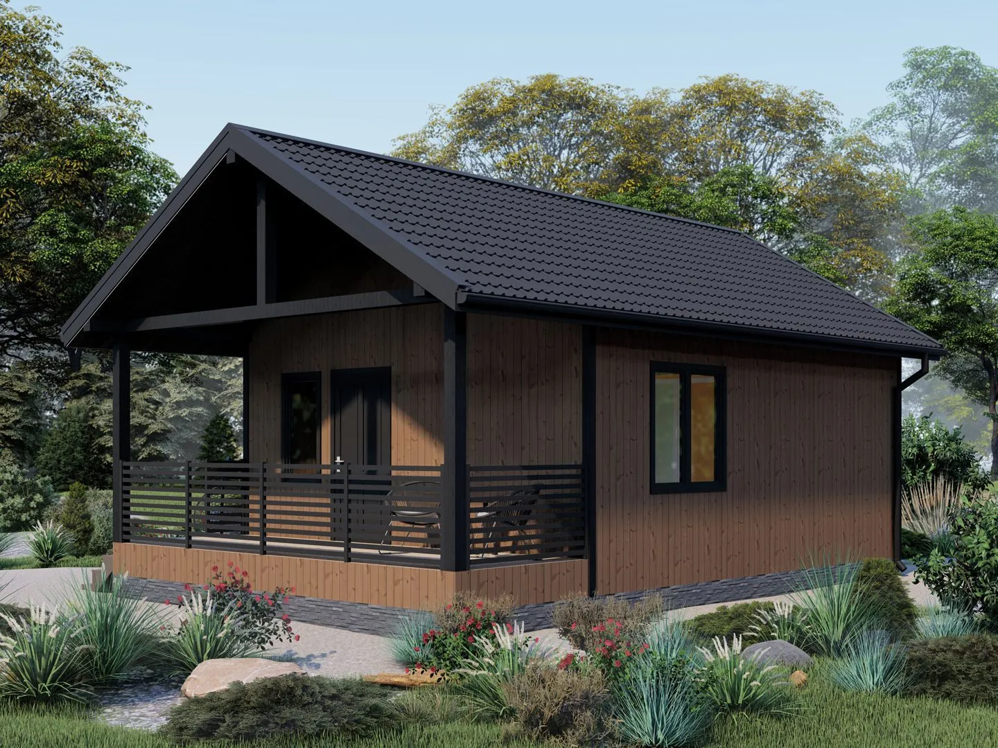 **Загородный дом «Рим‑2»** – это воплощение классической гармонии, рассчитанное для тех, кто ценит уединённость, комфорт и естественность. На первом (единственном) уровне размещаются все необходимые помещения, а круглогодичная адаптивность конструкции гарантирует уединённый отдых в любой сезон: в снегопадные дни тёплая деревянная стиляжа обволакивает дома, а в летнюю жару просторные внутренние помещения наполняют свежим воздухом. Стилистика «Рим‑2» подчёркивает изящество традиционного классического дизайна: аккуратные линии, симметрия и элегантные детали создают ощущение умиротворения. Деревянный каркас, защищённый современных материалов, дарит дому неповторимую теплоощущение и натуральность. Двускатная крыша не только подчёркивает профиль, но и обеспечивает надёжную защиту от осадков и ветра. Терраса «Рим‑2» становится естественным продолжением внутреннего пространства – здесь можно наслаждаться утренним кофе или вечерними закатами над тихой деревенской панорамой. А отсутствие балконов и веранд делает дома более «узаконённой» и защищённой от непогоды, а открытая поверхность террасы дополняет ощущение лёгкости. Именно эта комбинация простоты структуры и классической эстетики делает дом «Рим‑2» идеальным выбором для вашего нового загородного рая.