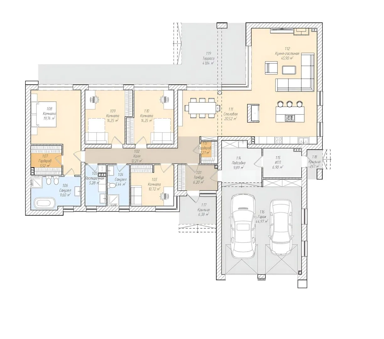 Построенный в классическом стиле, загородный дом ВС‑139 — это уют и надежность в одном флаконе. На одной надземной площадке раскрывается просторный и светлый внутренний двор, созданный с вниманием к деталям: от благородно оформленного фасада из газобетонных блоков до ровной, износостойкой плоской крыши. Всё это обеспечивает комфортное круглогодичное проживание, защищая от перепадов температуры и создавая непринужденную атмосферу уюта. Уникальная площадь дома проложена так, чтобы каждая зона работала сама за себя: открытый простор в гостиной, где естественный свет играет с мягкой планировкой; тихая спальня, где вам будет не открываясь ни слуха, ни шума, и современный кухонный блок, идеальный для семейных шедевров. Удобный прикрытый гараж предоставляет защиту вашим автомобилям и свободный доступ к дому в любую погоду. А уличная терраса, расположенная в тихом уголке, станет вашим личным уголком спокойствия: можно здесь выращивать специи и овощи, наслаждаться ранним утром или вечерним закатом в тишине своей зоны отдыха. Этот дом — идеальное сочетание практичности и эстетики. Если вы ищете место, где каждый элемент продуман, а комфорт – превыше всего, загородный дом ВС‑139 предложит именно то, что ищете: пространство для семьи, спокойствие от шума города и элегантную атмосферу классической архитектуры.