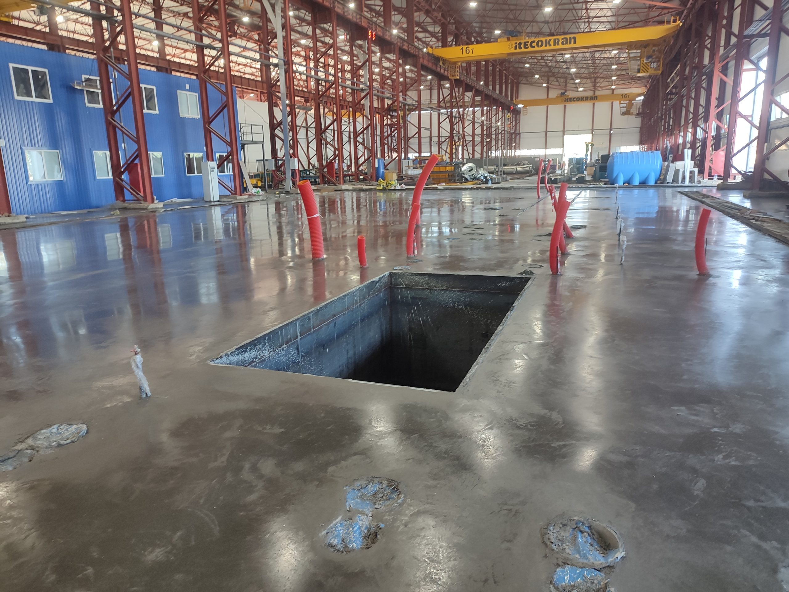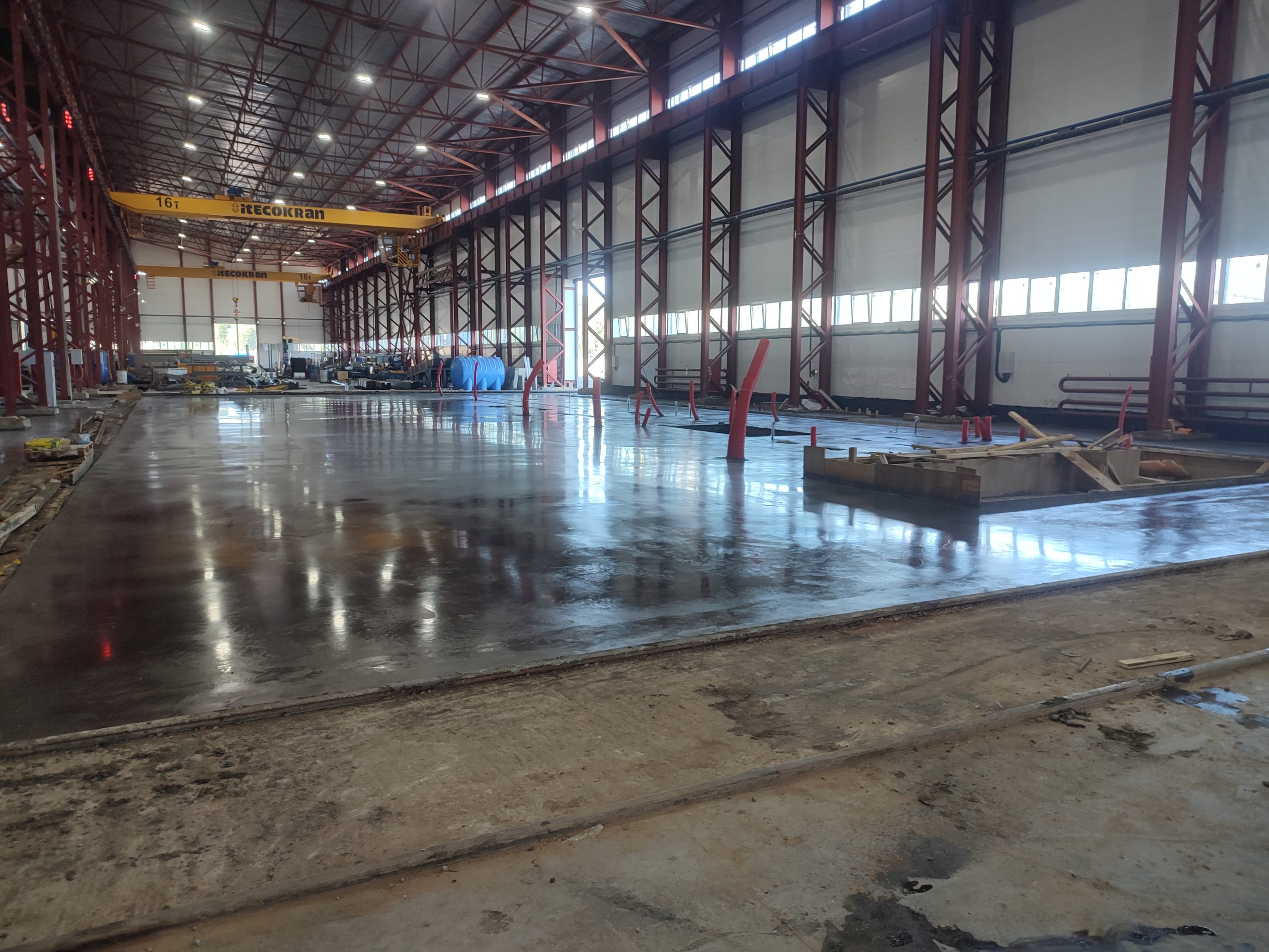 В цеху выполнена наливная стяжка пола. Работа проведена с точным соблюдением уровня и технологии, что обеспечило идеально ровное и прочное покрытие, готовое к интенсивной эксплуатации. Стяжка устойчива к нагрузкам и долговечна, обеспечивая комфортную и безопасную рабочую поверхность.