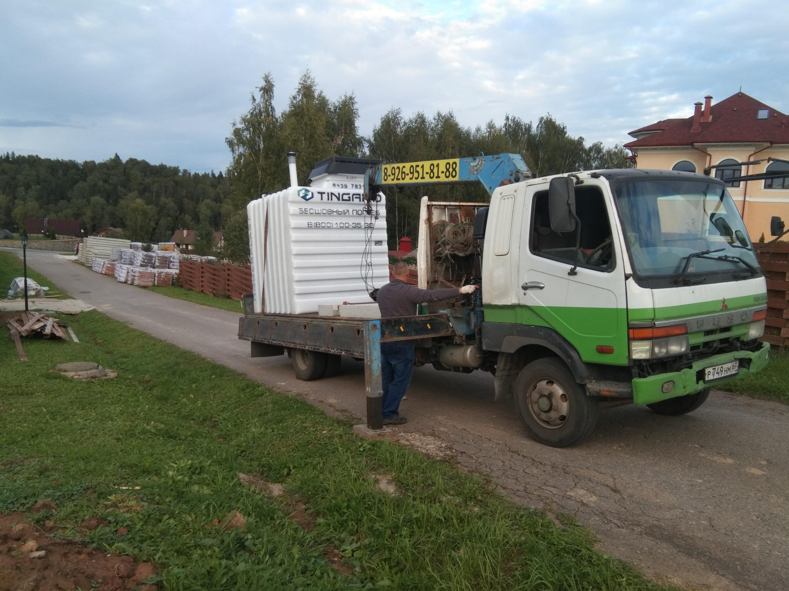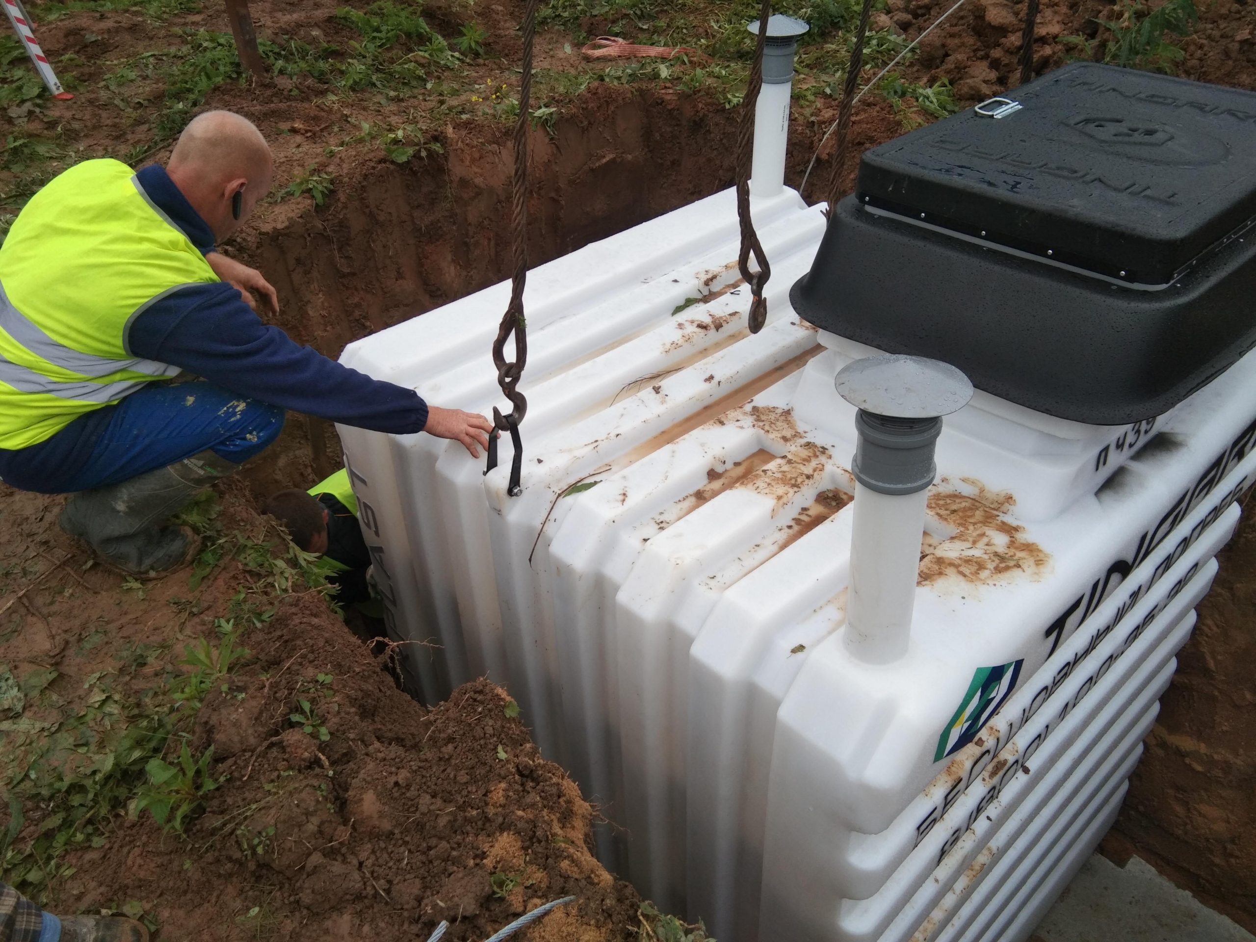 Установлен готовый пластиковый погреб, закапываемый в землю. Конструкция герметична, устойчива к давлению грунта и долговечна. Монтаж выполнен с соблюдением всех строительных и гидроизоляционных норм, что обеспечивает надёжное хранение и защиту содержимого.