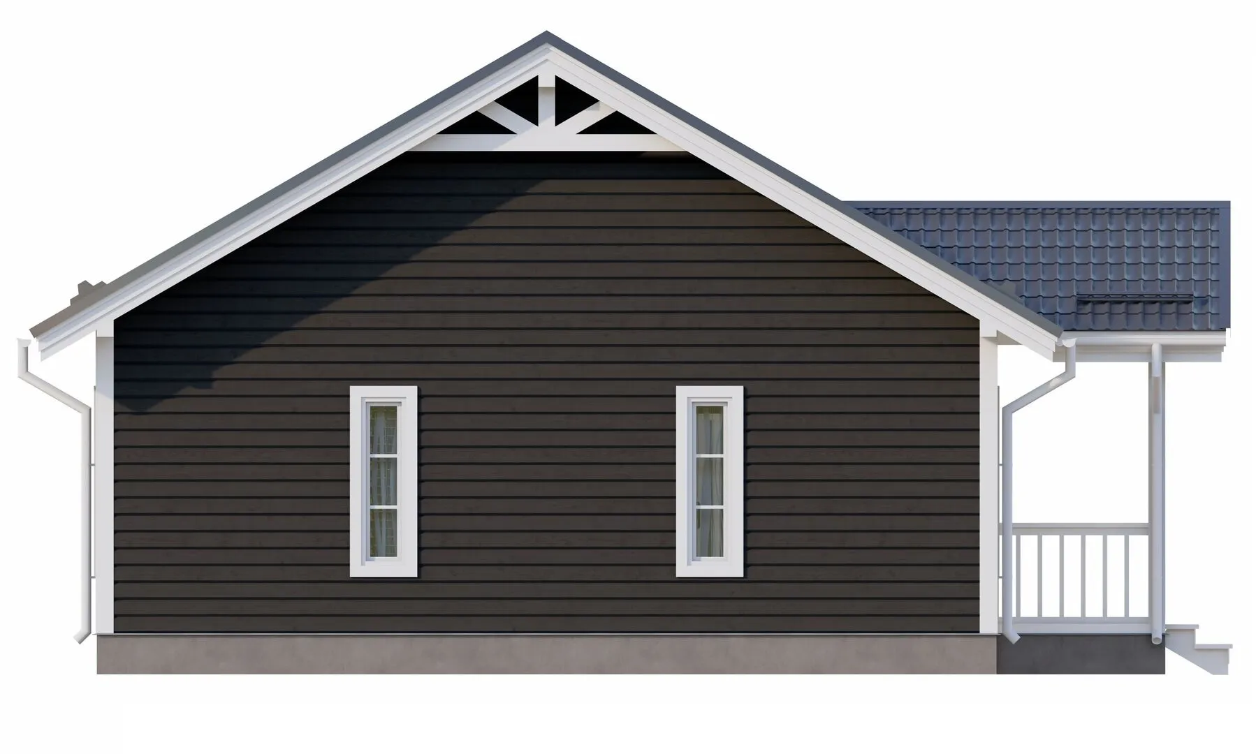 Общая внутренняя площадь — порядка 76 м² (плюс крыльцо 5,5 м²). При этом дом остаётся очень компактным по габаритам и недорогим в строительстве.
