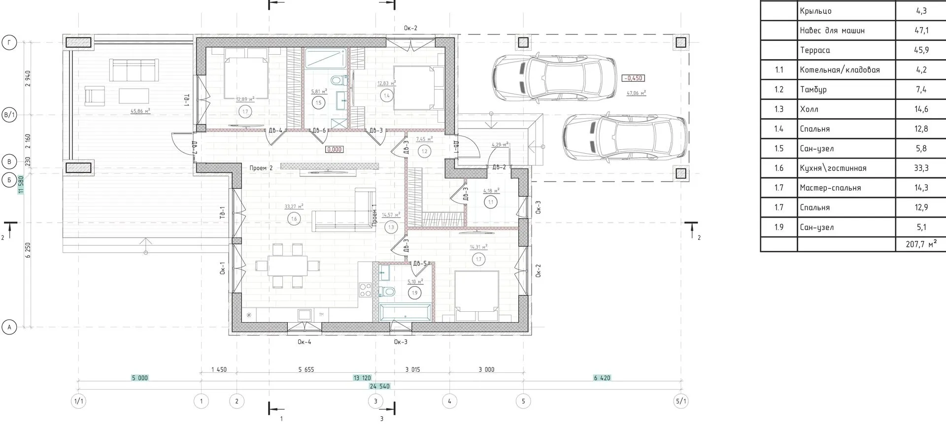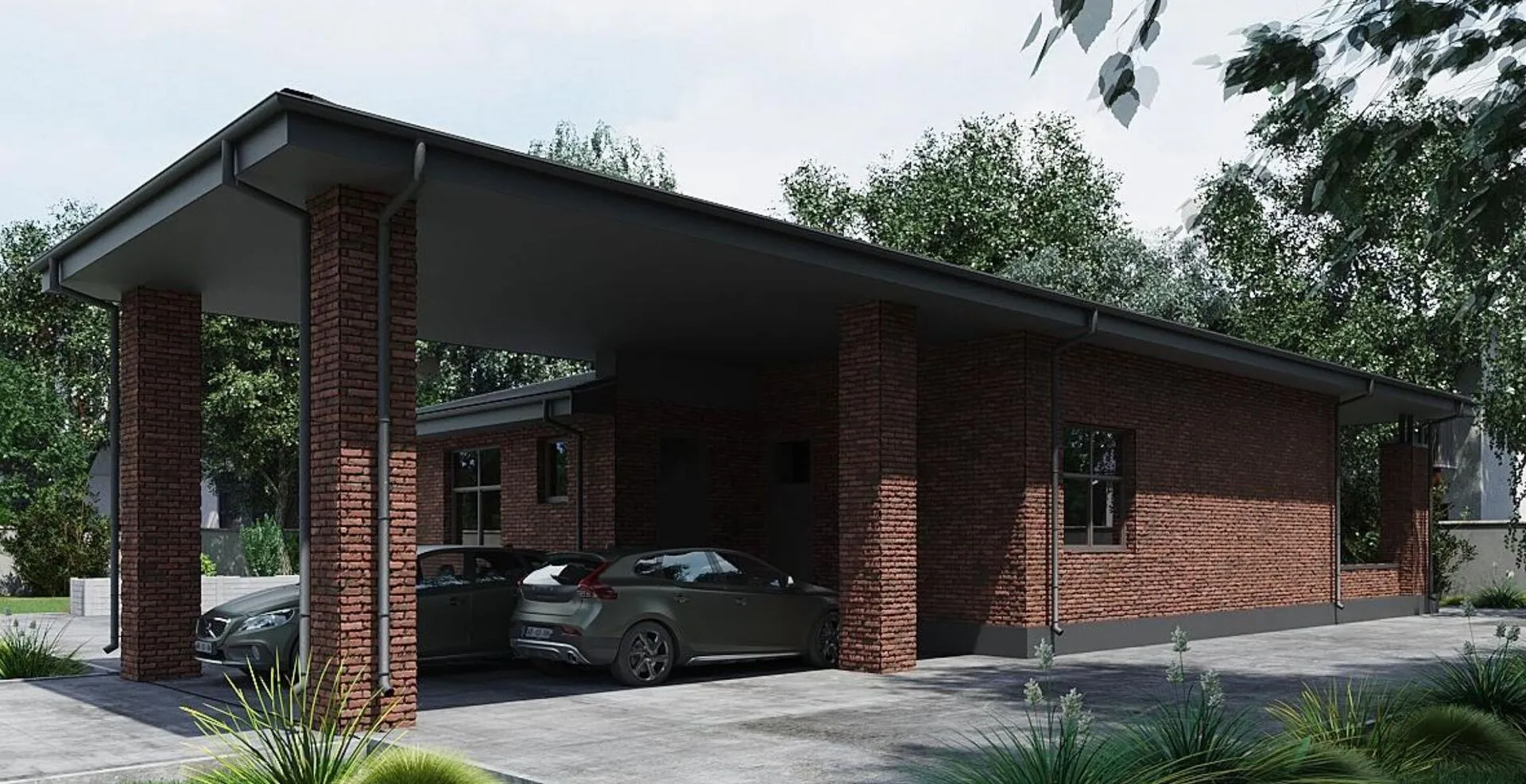 Дом с навесом для машины и террасой ,в стиле «PLAIN»