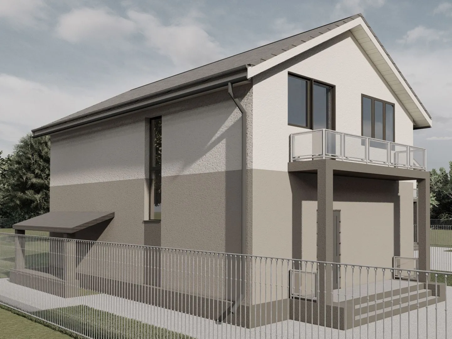 Двускатная крыша придаёт характер и завершённость образу. Одна стильная балкон-лоджия открывает вид на улицу — отличное место, чтобы подышать свежим воздухом или провести вечер за наблюдением заката.