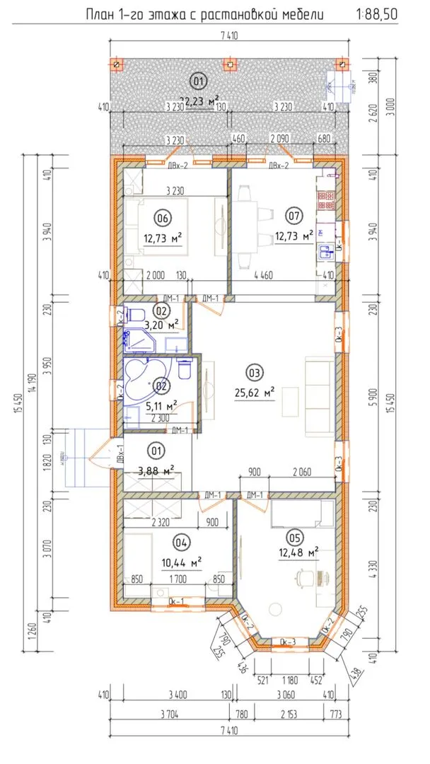 Насладитесь уютом и элегантностью простого, но изысканного жилья, где каждый элемент продуман до мелочей. Индивидуальный жилой проект ОС‑24‑38 воплощает в себе классический стиль с прямыми линиями, каменной отделкой и аутентичной атмосферой, которую хочется ощущать во всех сезонах. Единый надземный этаж обеспечивает удобный доступ, а отсутствие лестниц и подъемов делает дом особенно привлекательным для семей с детьми и посетителей с ограниченной мобильностью. На открытой террасе вы сможете наслаждаться теплыми летними вечерами, а в прохладные осенние дни наслаждаться свежим воздухом, сидя в тени вечного каменного фасада. Четырехскатная вальмовая крыша придает дому гармоничную пропорцию, одновременно защищая пространство от непогоды и придавая ощущение защищённости. Сочетание кирпичной облицовки и классического дизайна создает ощущение надёжности и тепла, делая ваш дом местом, где хочется возвращаться после долгого дня. Это не просто квартира – это уютный уголок, где каждая деталь создана для комфорта и вдохновения.