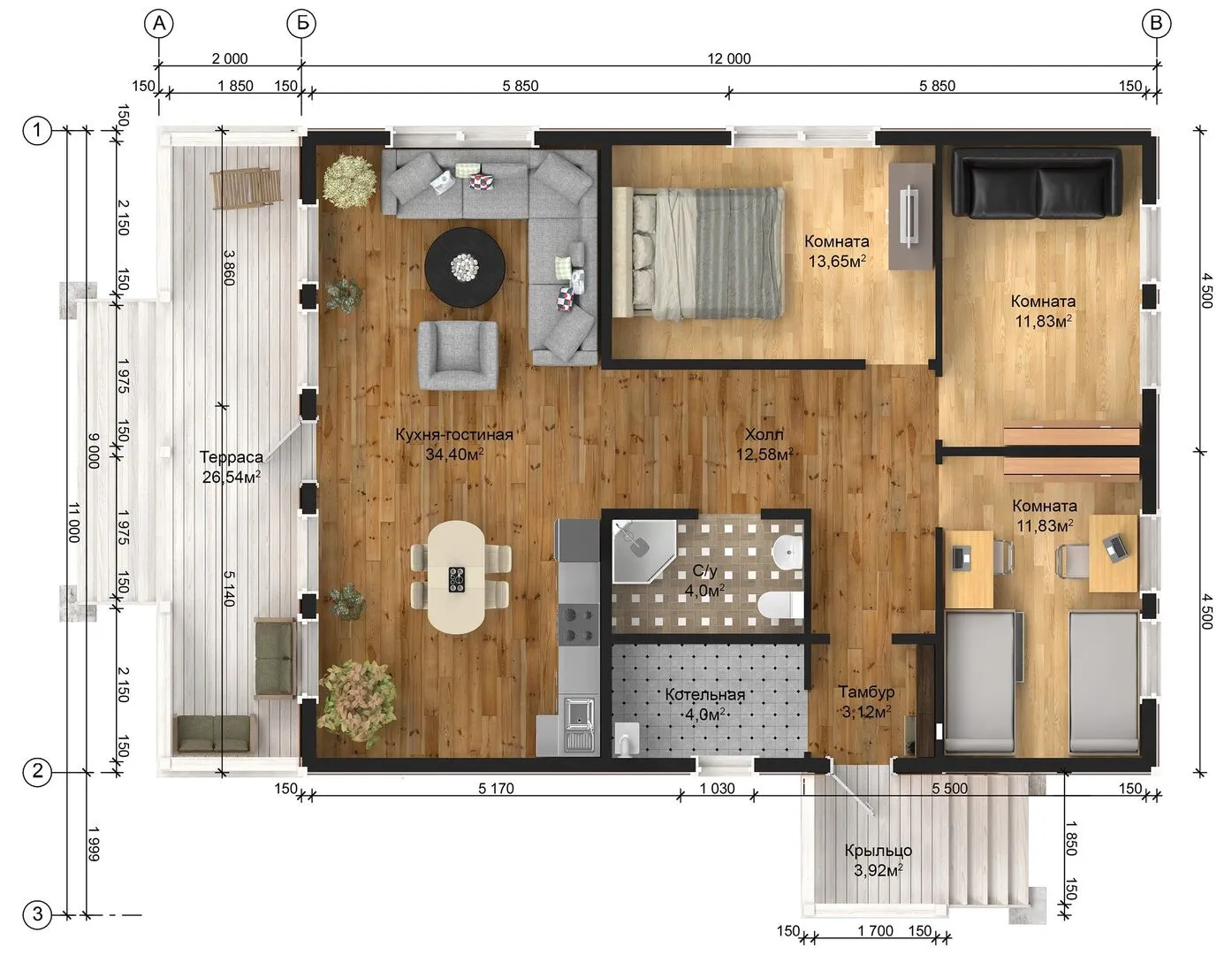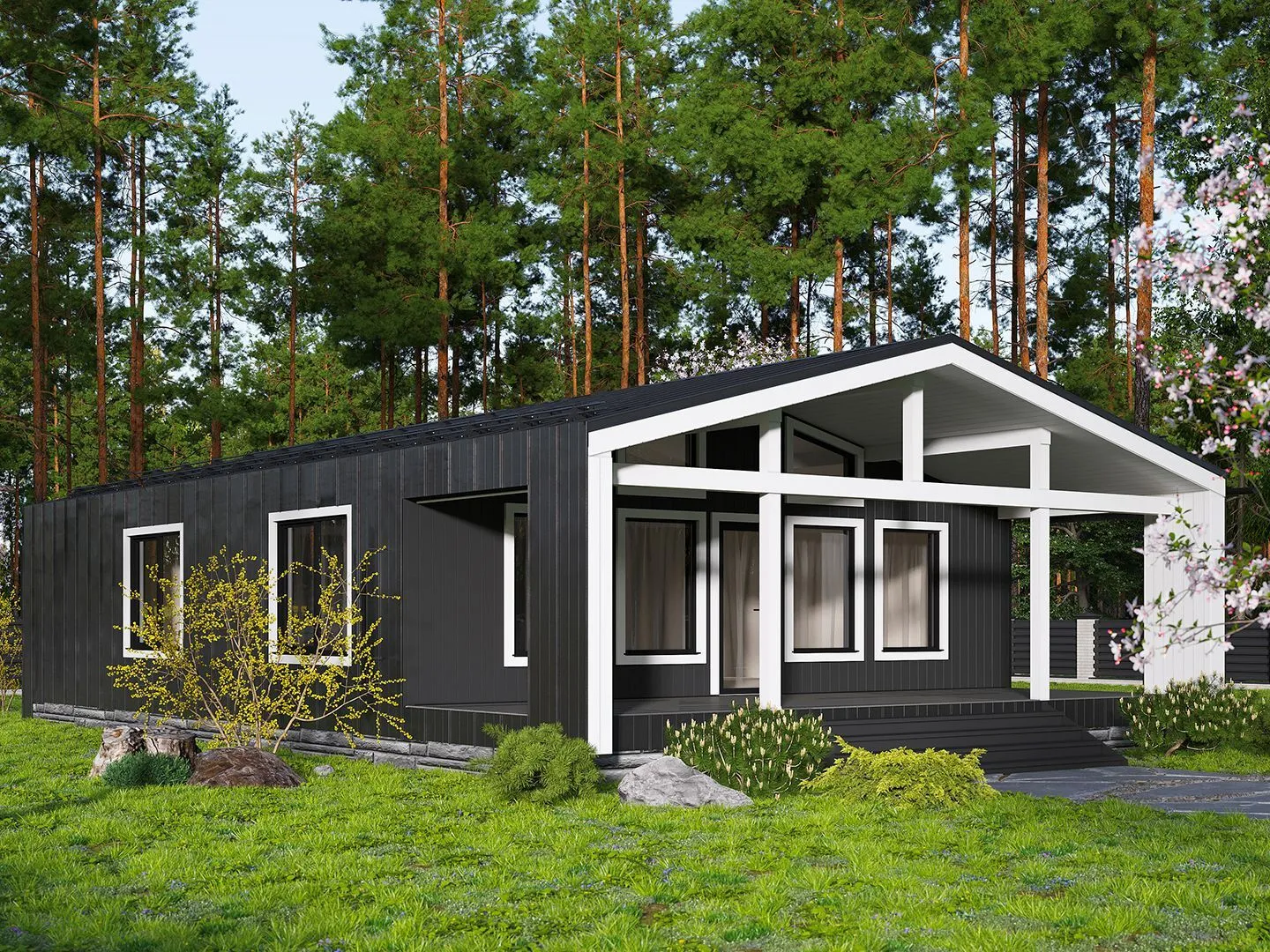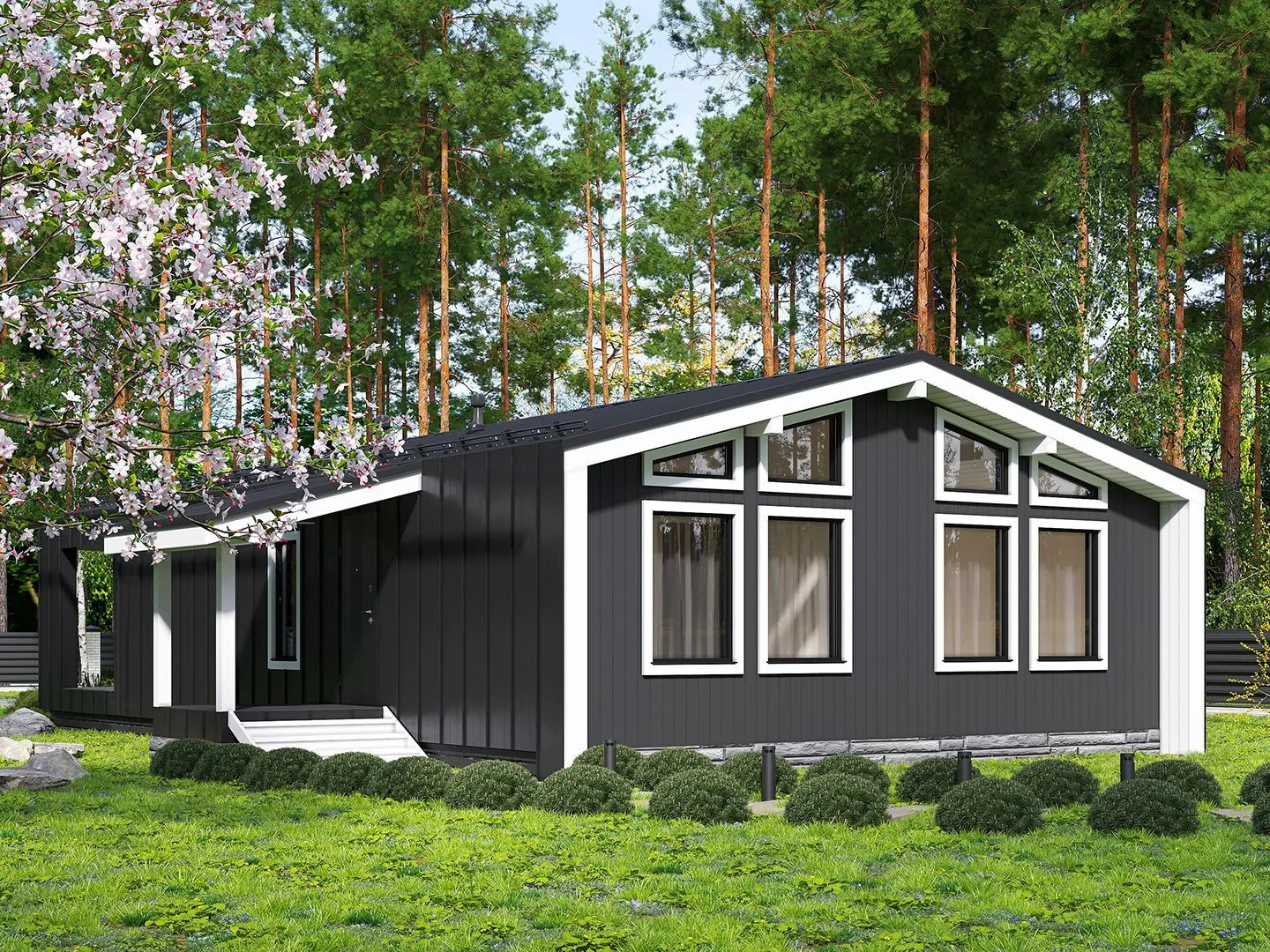Идеальный выбор для тех, кто ценит уют, простоту и современный комфорт – каркасный дом по проекту **Идеал 121**. Застройка занимает всего один надземный этаж, но при этом вмещает все необходимое пространство для круглогодичного проживания. Архитектура в стиле *Barnhouse* привносит в дом тепло и характерные деревянные детали, создавая ощущение уюта и защищённой простора. Внешняя часть дома выполнена из прочных деревянных каркасов, которые придают фасаду легкость и современный вид. Крыша – классический двускатный вариант, который уверенно укрывает дом в любую погоду. Особенностью проекта является просторная терраса, где можно отдыхать на свежем воздухе, наблюдая за садом или просто наслаждаясь тишиной соседней природы. Внутри вас ждёт хорошо продуманный план, где каждый уголок предназначен для удобства и функциональности, а отсутствие балконов, веранд и гаража позволяет сосредоточиться на главном – живущем пространстве и его гармонии. Постройте свой дом, который будет не просто жильем, а настоящим убежищем от суеты. **Идеал 121** – это сочетание традиций и современности, гарантированный комфорт и возможность наслаждаться жизнью в собственном, уютном уголке. Оставьте заявку прямо сейчас, и мы поможем вам воплотить в реальность ваш идеальный дом!