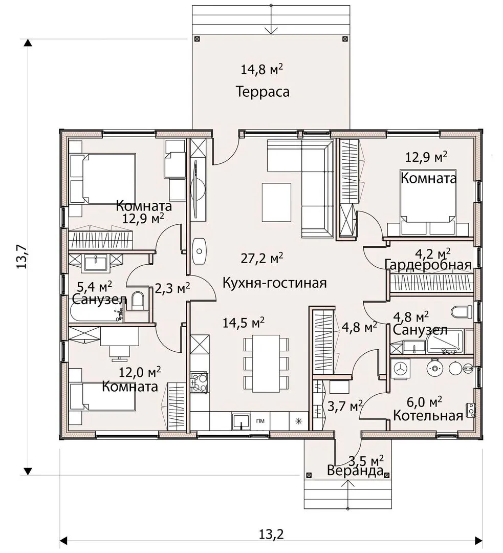 Индивидуальный жилой дом площадью 132м2 с террасой площадью 15м2