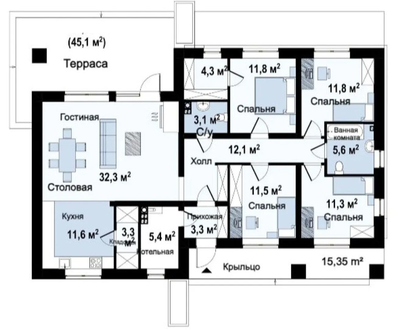 Заказать конусльтацию по:Одноэтажный дом с четырьмя спальнями S3-127-5 (Z349)