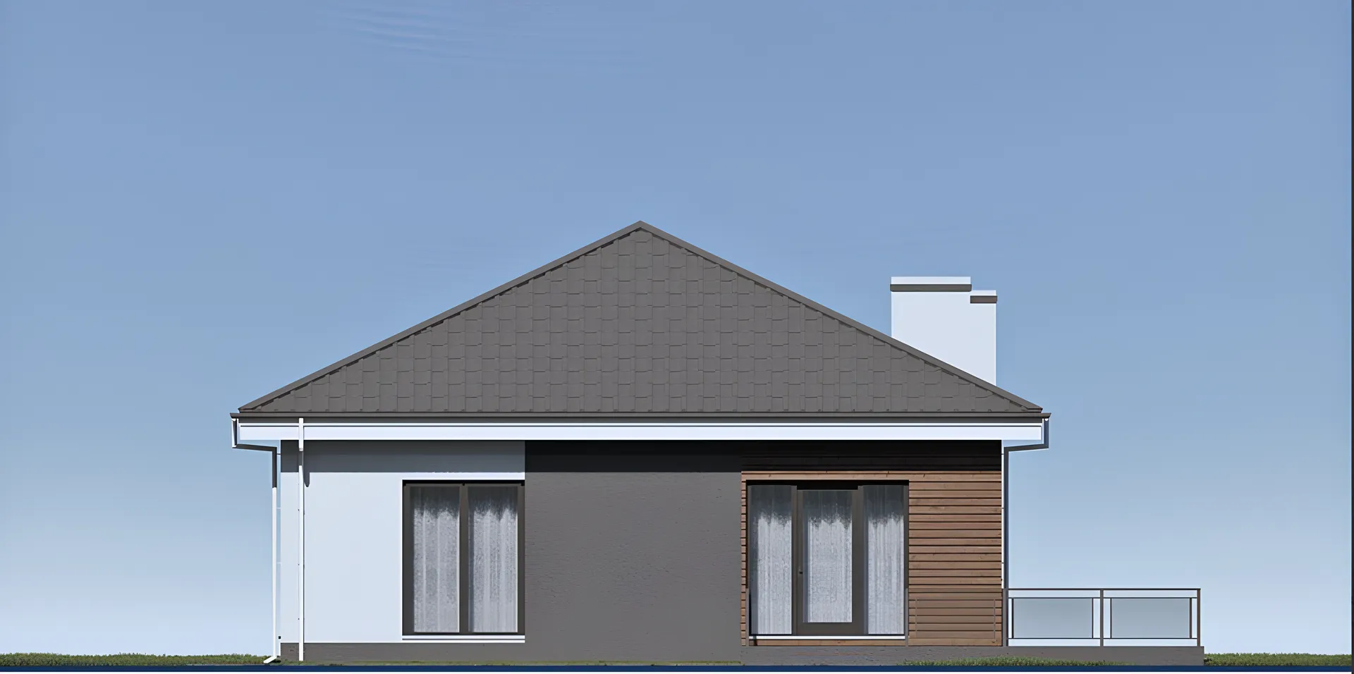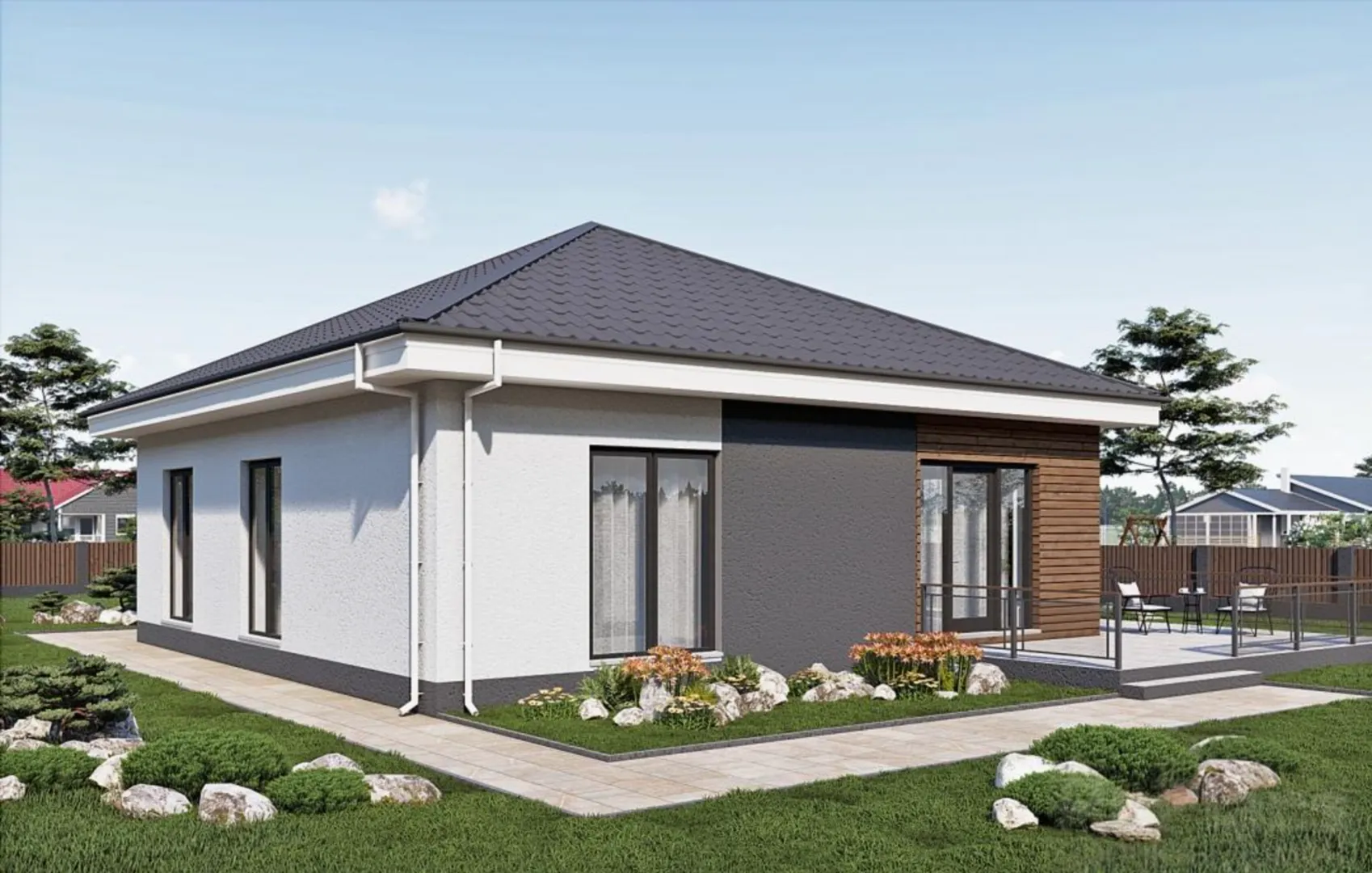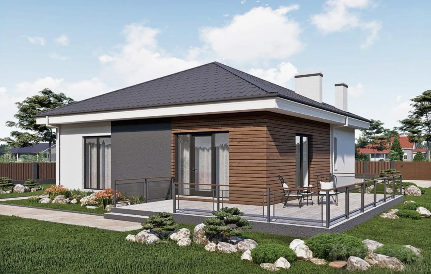 Одноэтажный дом с террасой, 3 спальнями и отделкой штукатуркой