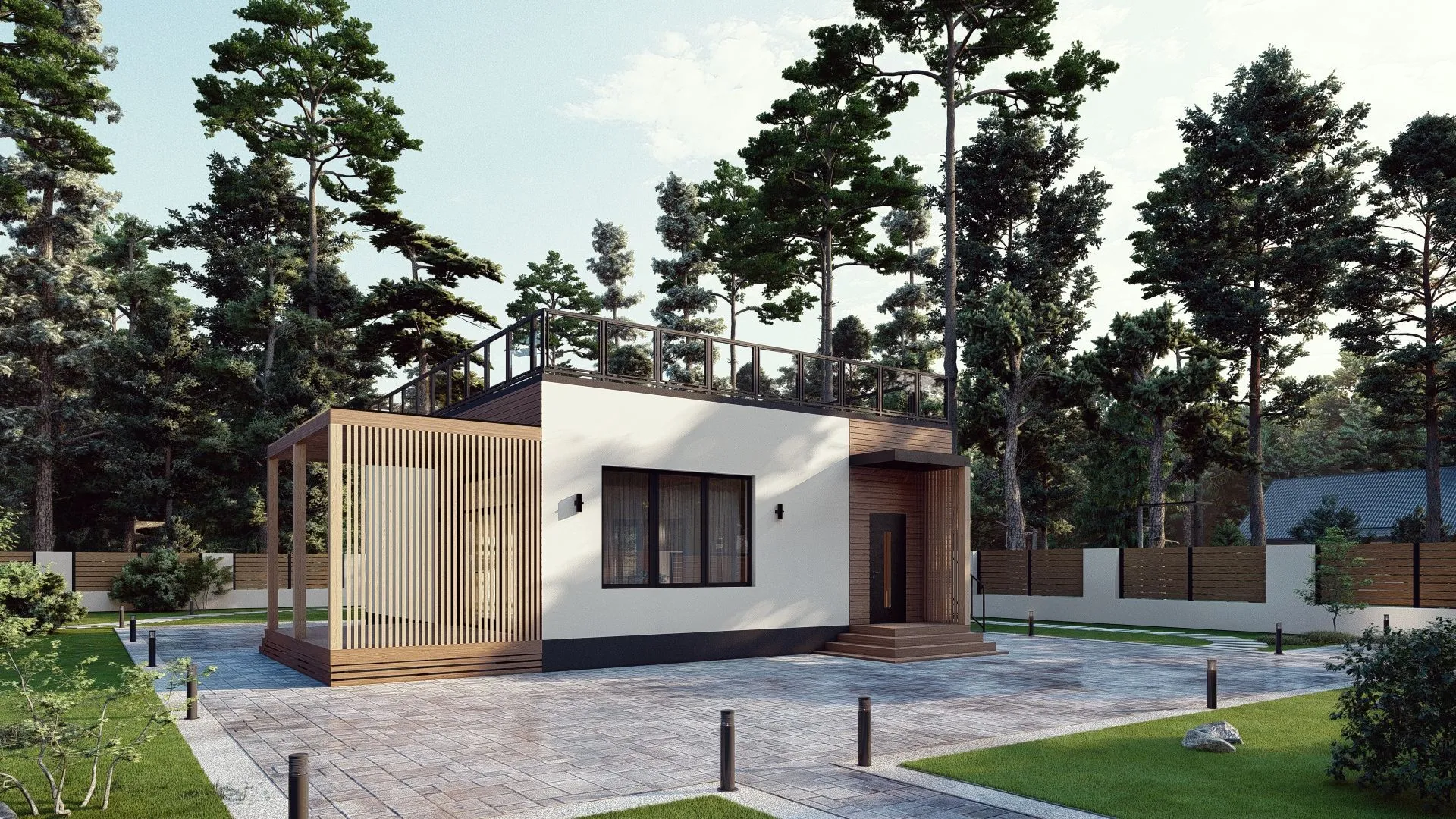 Заказать конусльтацию по:Одноэтажный дом террасой на крыше ДПБ34