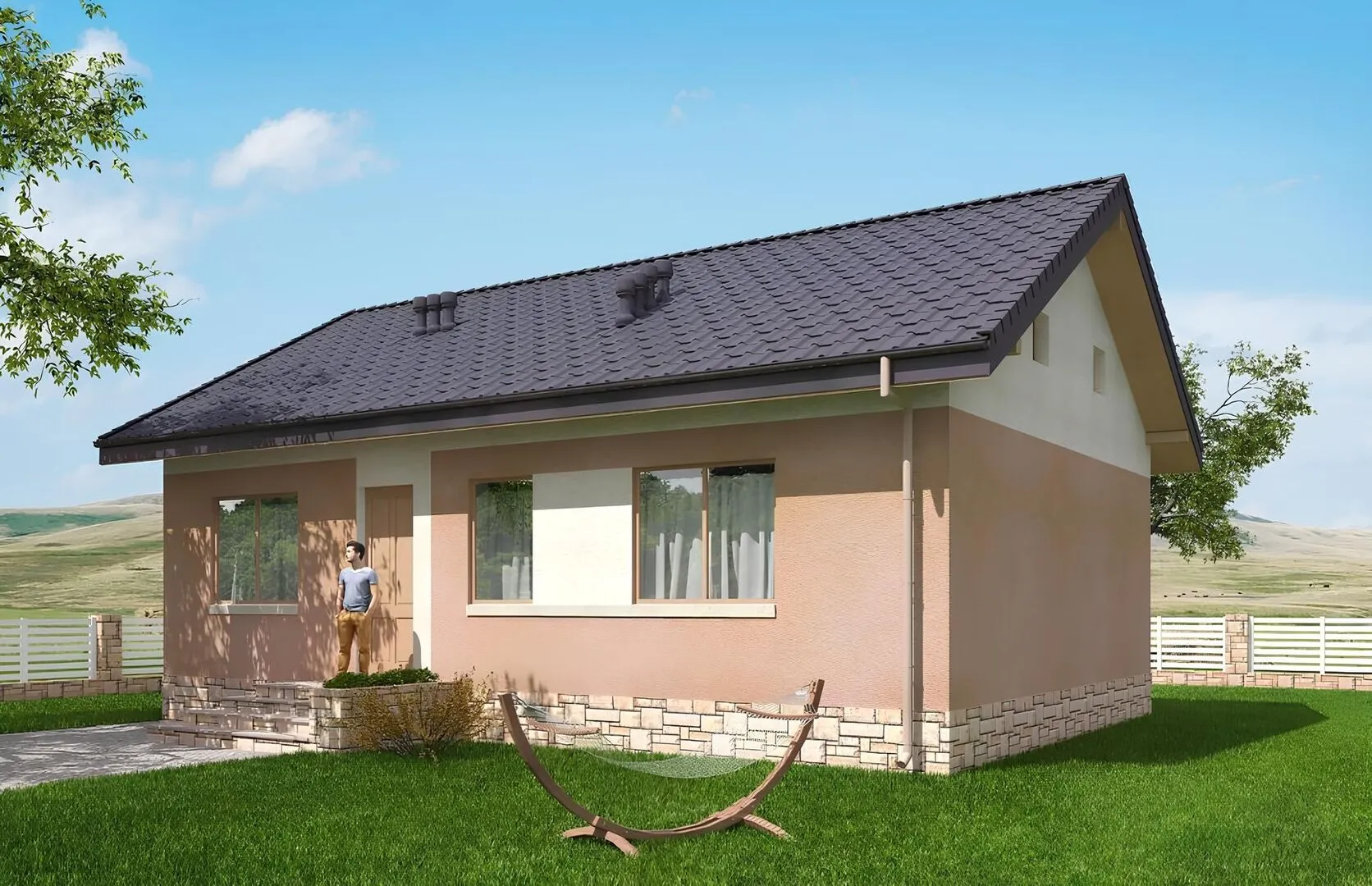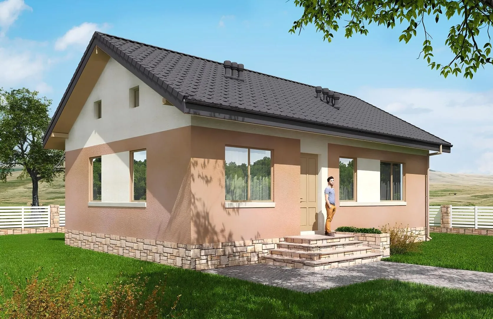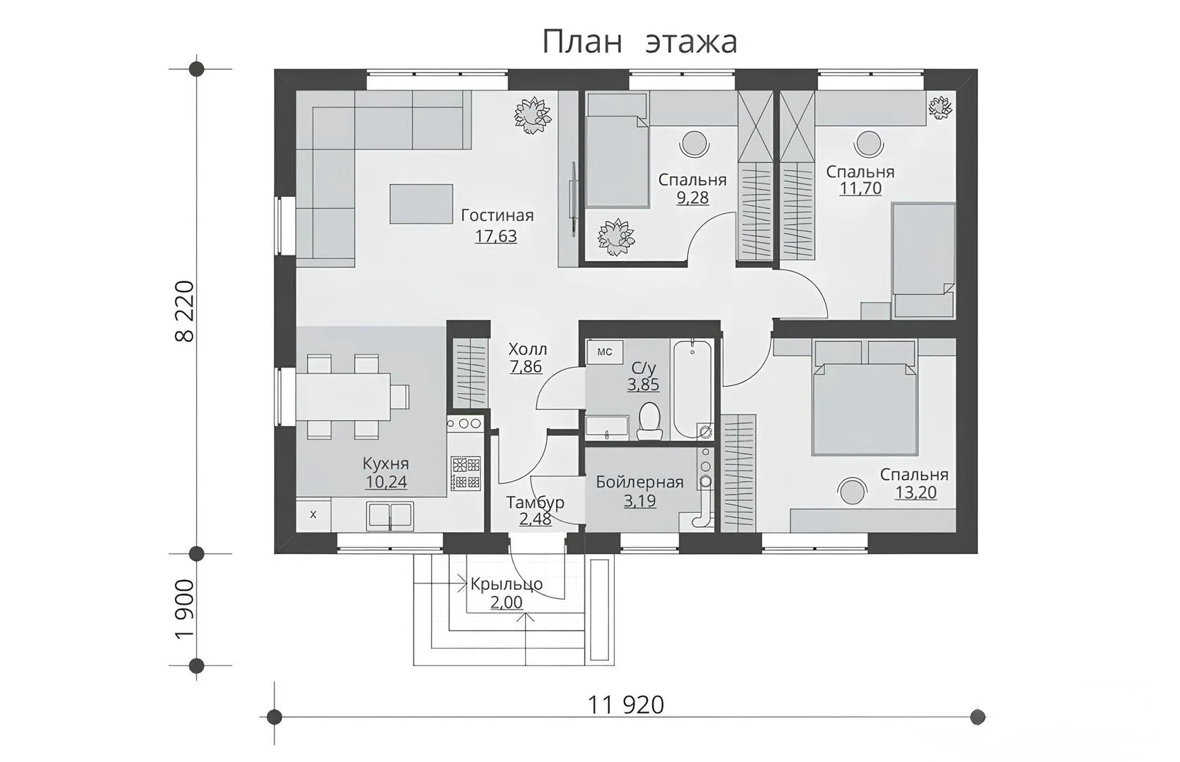 Одноэтажный жилой дом c тремя спальнями и крыльцом