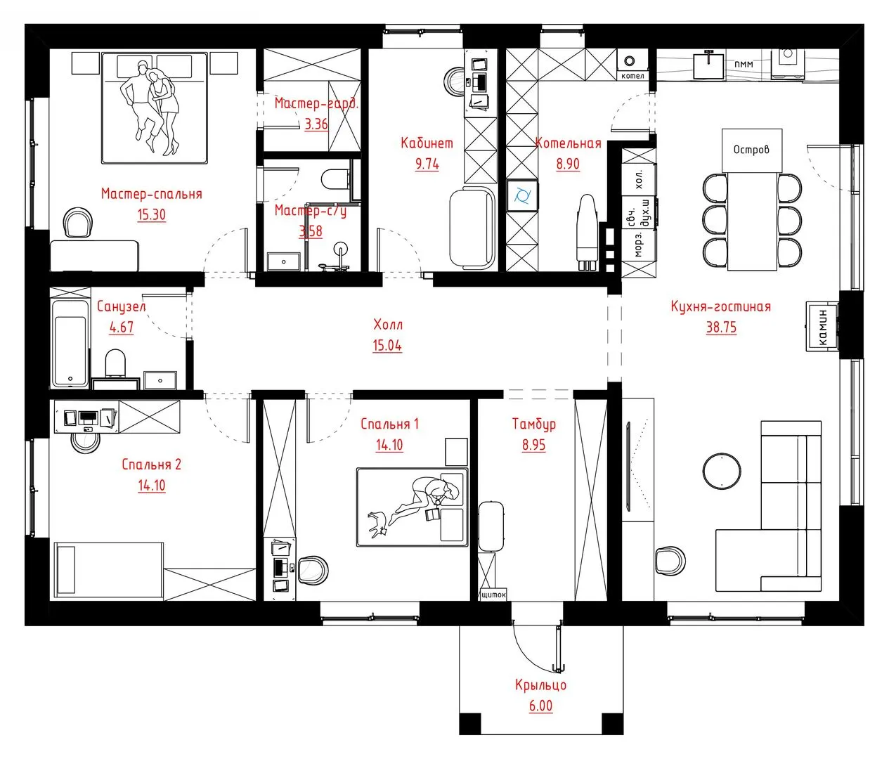 **Скандинавия‑136** – это элегантный уголок спокойствия, где каждая деталь продумана до мельчайших нюансов. Дом построен в строгом скандинавском стиле, сочетая простоту линий и теплоту натуральных материалов. На светлых фасадах заметны выдержанные кирпичные стены, а в мягком свете двускатная крыша создает образ уверенного и гостеприимного дома, способного вместить семью на протяжении всего года. Одноэтажная планировка делает этот дом идеальным для тех, кто ценит удобство и беззаботность. Личный пространство открытое и светлое, а чердачное помещение добавляет характер и функциональность – отличное место для хранения, уютного домашнего офиса или творческого уголка. Уютный внутренний двор без веранды подчёркивает лаконичность фасада, а отсутствие балконов и гаража делает дом более чистым и современным. **Скандинавия‑136** приглашает вас ощутить дух простоты и благополучия, который дарит скандинавская архитектура. В этом доме каждый день наполнен гармонией простых решений и практической красотой. Запланируйте визит – вы увидите, как уют и стиль могут гармонично сочетаться в одном пространстве.