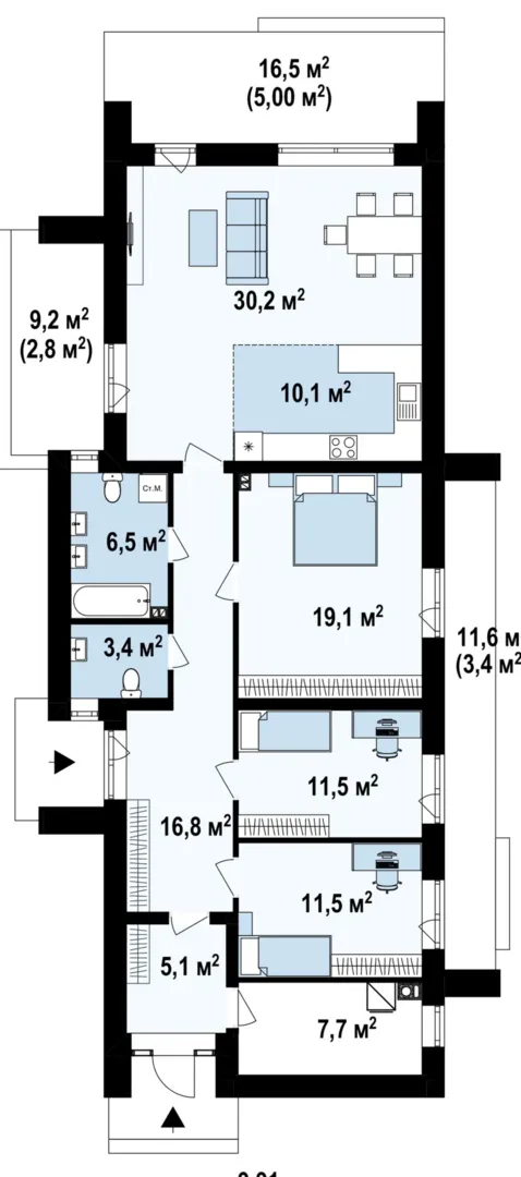 Сердце современных идей и уютного уединения встречаются в этом одноэтажном доме, созданном в стилевом ключе барнхаус. В его панорамных окнах S3‑122‑6 вы ощутите свободное пространство с каждом уголка: яркое солнце рассекает просторные комнаты, а ветры летнего вечера играют с мягкой тёплой подсветкой. Дом рассчитан на круглогодичное проживание: тепло сохраняется благодаря газобетонным блокам наружных стен, а габлучная крыша придаёт ему аутентичность и надежность. Мягко раскрываясь к окрестностям, дом обрамлен простонародной террасой, где каждая тропинка ведёт к рассвету и закату, создавая идеальное место для вечерних бесед и семейных ужинов. Отделка выполнена в лаконичном барнхаус-стиле: грубый, но элегантный внешний вид в сочетании с современными элементами, такими как панорамные окна и открытые световые потоки, создают ощущение открытости и свободы, сохраняя при этом тепло и уединение. Этот дом – это не просто жильё, а убежище, где каждое мгновение обрамлено природой и комфортом, идеальное для тех, кто ценит простоту, элегантность и гармонию с окружающим миром.