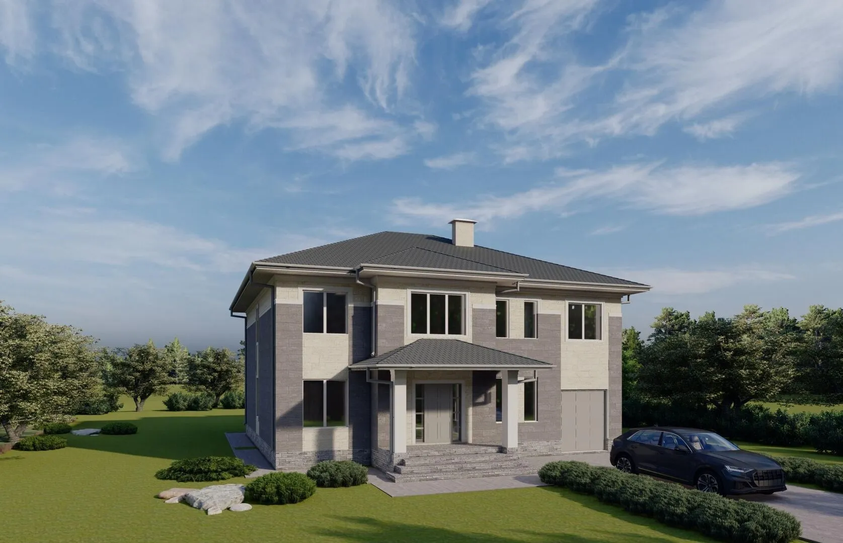 Разместившись в живописном уединении за городом, загородный дом АС‑239 в европейском стиле выглядит как оазис спокойствия и уюта. Спроектирован он с двумя надземными этажами, что обеспечивает достаточное пространство для семейного уюта, а чердачное помещение открывает дополнительные возможности: хранилище, небольшую мастерскую или даже современный гардероб. Круглогодичное проживание гарантирует комфорт в любой климатической ситуации — тепло в зимний период и прохлада в жару благодаря качественной теплоизоляции газобетонных блоков и комбинированной кровле. На уровне первого этажа вас встретит просторный гостиной, где сквозь большие окна светятся живописные пейзажи. Балкон‑лоджия над площадью позволяет наслаждаться свежим воздухом и утренним кофе, а терраса вдоль задней стены служит идеальным местом для летних барбекю и вечеров на открытом воздухе. Пристроенный закрытый гараж или крытая автостоянка защищают транспорт от непогоды, создавая ощущение полной защищённости и комфорта. Каждый элемент этого дома продуман до мелочей, сочетая эстетику и практичность, чтобы вы могли наслаждаться жизнью в самом сердце природы, не отказываясь от удобств современного быта.