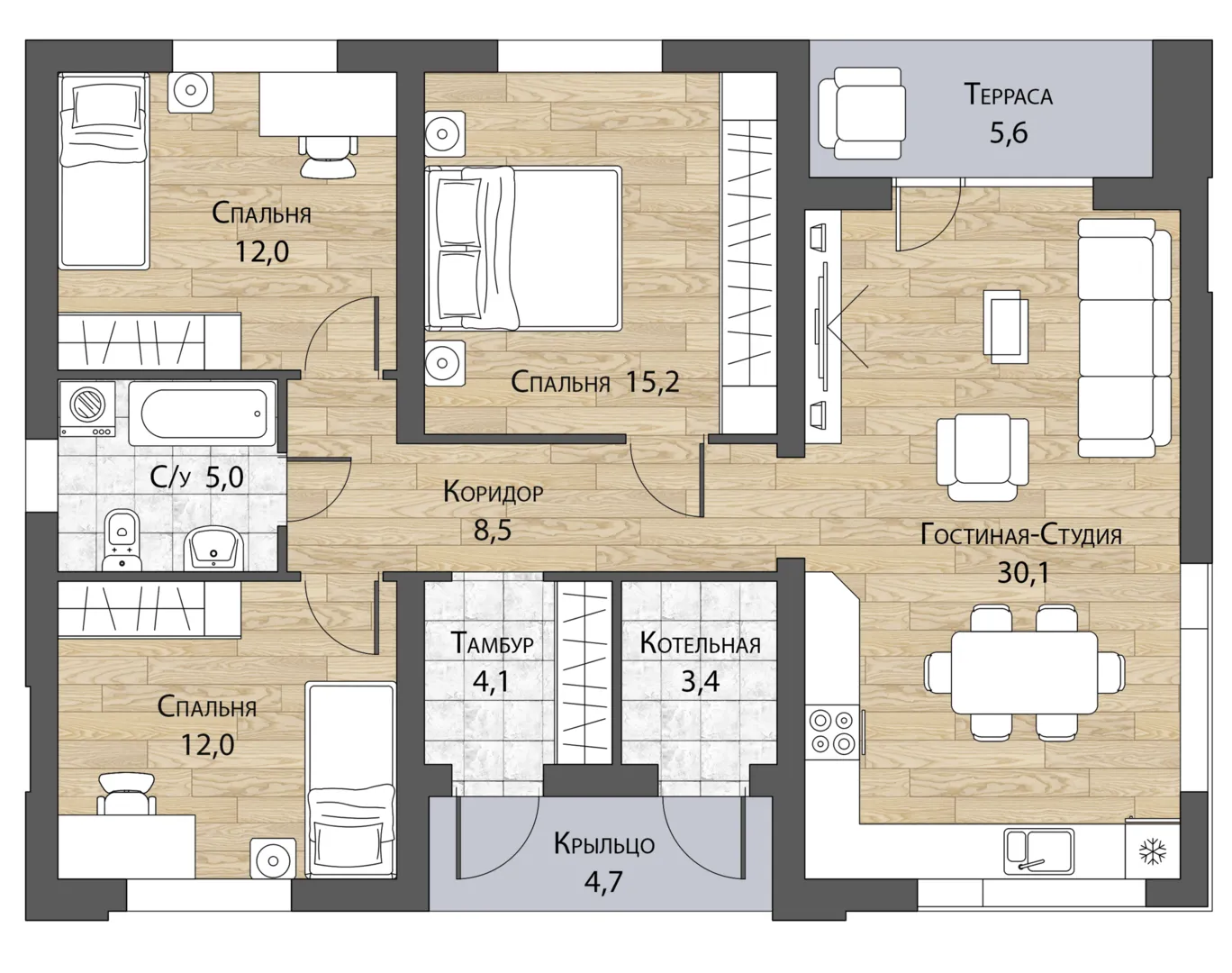 **Дом семейных мечтаний — КД‑90п** Просторный, но скромный, этот одноплоскостной загородный дом в стиле минимализма дарит ощущение свободы и уюта. Его открытые, светлые комнаты располагаются в гармоние с природой: широкой площадью, свободными пространством и лёгкостью архитектурного решения. Дом рассчитан на круглогодичное проживание, поэтому качественная теплоизоляция газобетонных блоков и плоская кровля обеспечат комфорт даже в самые холодные дни. Важная особенность КД‑90п — просторная терраса, выходящая из центрального подъёма, где можно наслаждаться тихими вечерами, любуясь закатом над зелёной нивой. Отсутствие балконов и веранд не мешает ощущению открытости: внутреннее пространство свободно от загромождающих элементов, а чистые линии и лаконичные фурнитуры подчёркивают современный минимализм. Дом создан как уютный оазис, где каждый элемент обдуман до мельчайших деталей: от крепких газобетонных стен до продуманного дренажа плоской кровли. Он призван стать вашим убежищем от шума города, местом, где можно спокойно отдыхать, творить и проводить время с семьёй, наслаждаясь природой в каждом уголке.