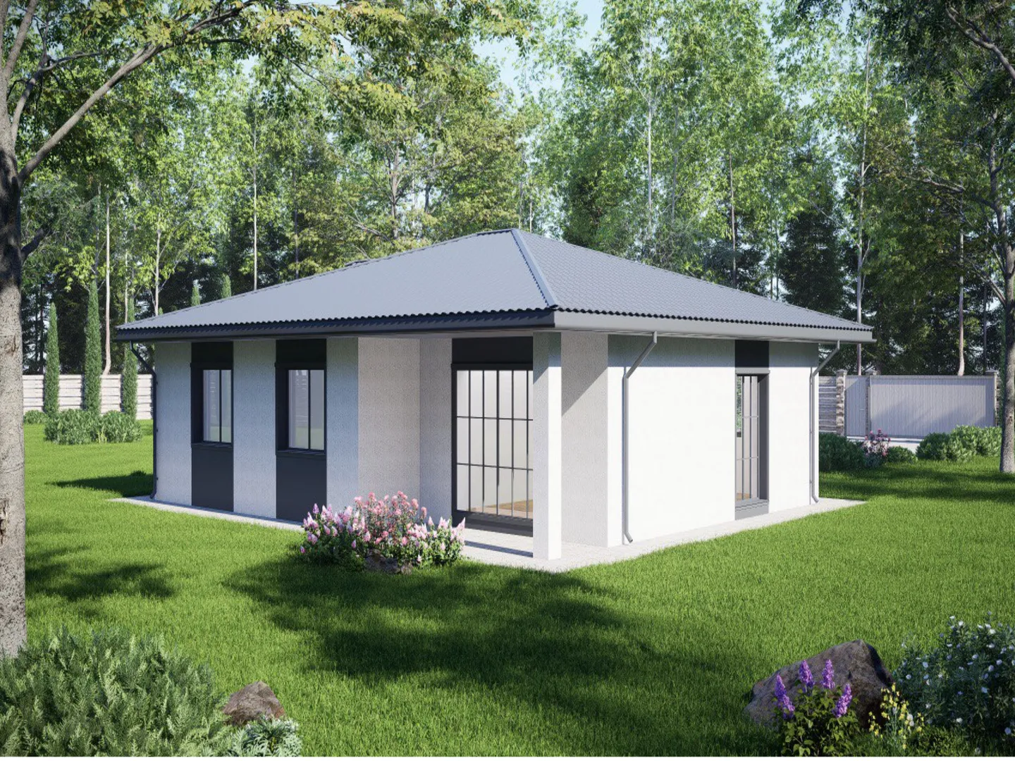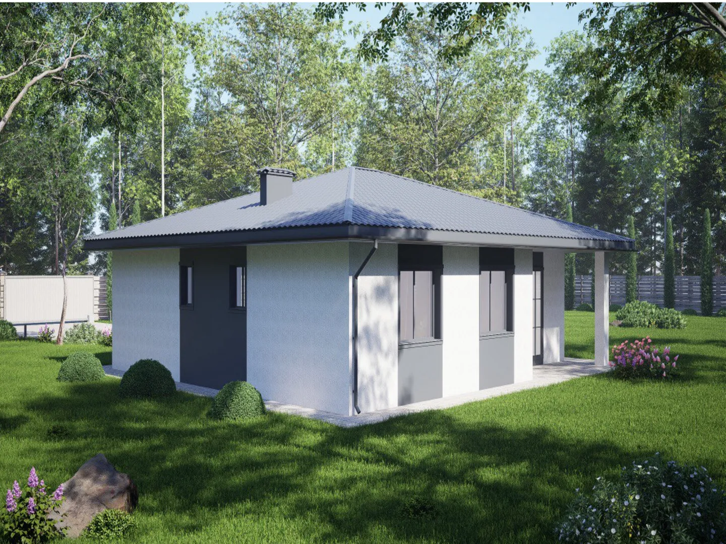 Добро пожаловать в уютный загородный дом *«Комфорт+»* – идеальное сочетание классической эстетики и практичности, созданное, чтобы стать вашим личным оазисом в сердце природы. Одна открытая планировка, выполненная из дышащего газобетонного стекла, дарит ощущение лёгкости и тепла на протяжении всего года. Вальмовая, четырехскатная крыша нежно обрамляет просторные зоны и защищает от непогоды, в то время как терраса приглашает открыть окно в мир, где можно наслаждаться утренним кофе или вечерним закатом. Весь дом пропитан светом, благодаря широким окнам и продуманному освещению, создавая атмосферу уюта и благополучия. Дом «Комфорт+» спроектирован так, чтобы полностью удовлетворить потребности современного стиля жизни. Классический архитектурный стиль подчёркивает элегантность и непритязательность, а отсутствие балконов и веранд позволяет сосредоточиться на гармоничной, открытой планировке. Внутри пространство удобно разделено, а просторное жилое коридорное пространство обеспечивает комфортное движение по дому. Хотя прицепного гаража нет, предусмотрена крытая автостоянка, а свободные участки вокруг дома дают возможность при необходимости установить парковку или заправить автозапчасти. Этот дом идеален для тех, кто ценит простоту, безопасность и возможность наслаждаться природой без лишних изысков.