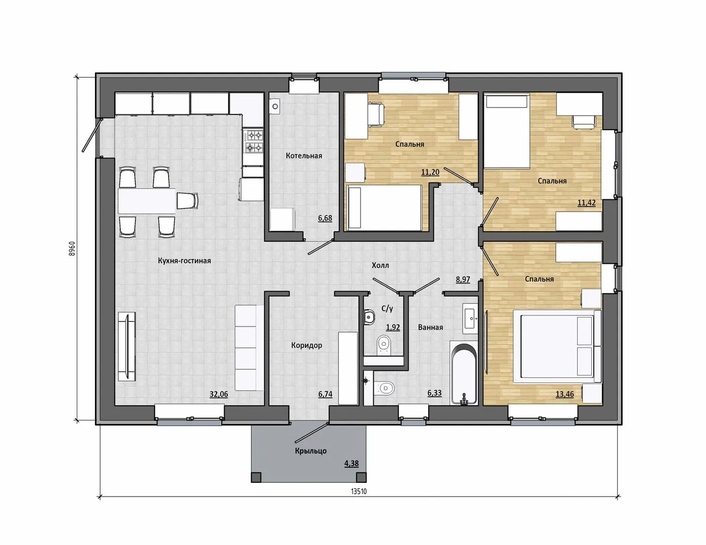 Добро пожаловать в **Light 100** – одноповерхный дом, созданный для тех, кто ценит уют и простоту, но при этом не хочет отказываться от надёжности и изысканного стиля. Строительство на газобетонных блоках гарантирует отличную тепло- и звукоизоляцию, а комбинированная крышу защищает от перемен погоды, обеспечивая круглогодичное комфортное проживание. Классический архитектурный облик подчёркивает элегантность и традиционность, даря ощущение спокойствия и гармонии с природой. Внутри дома царит простор и свободный поток света благодаря открытому плану с чётко обозначенными зонами для семьи и гостей. Отдельная башенка с чердачным помещением открывает возможности для мастерской, кладовой или комфортного уголка отдыха. Несмотря на отсутствие балконов, ложей и веранд, каждый элемент площадей пронизан практичностью и вниманием к деталям. Просторные двери и открытые переходы создают ощущение простого, но современного пространства, где каждый уголок может стать вашим личным местом. Ваше новое жильё – сочетание классицизма, практичности и теплого домашнего уюта, которое станет идеальной обителью для семьи.