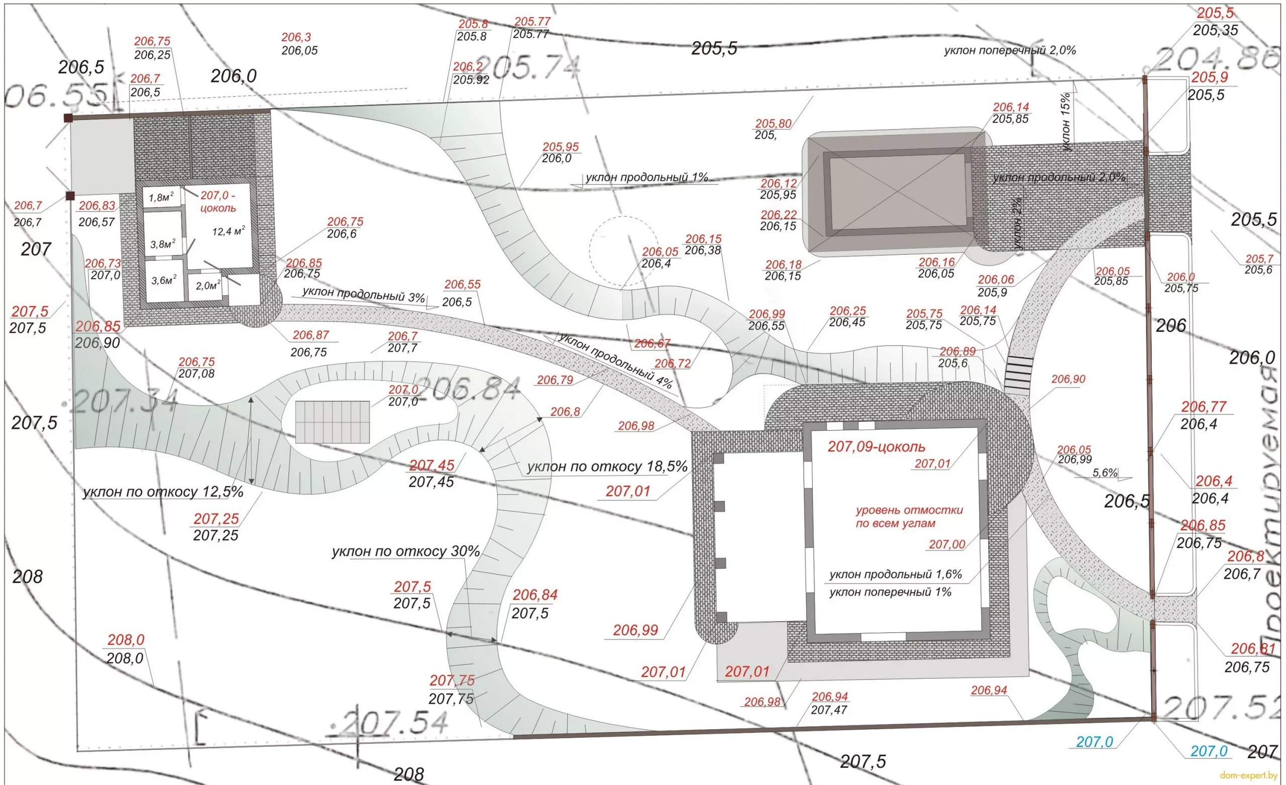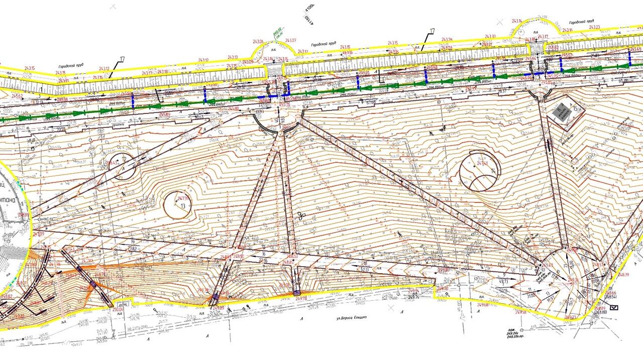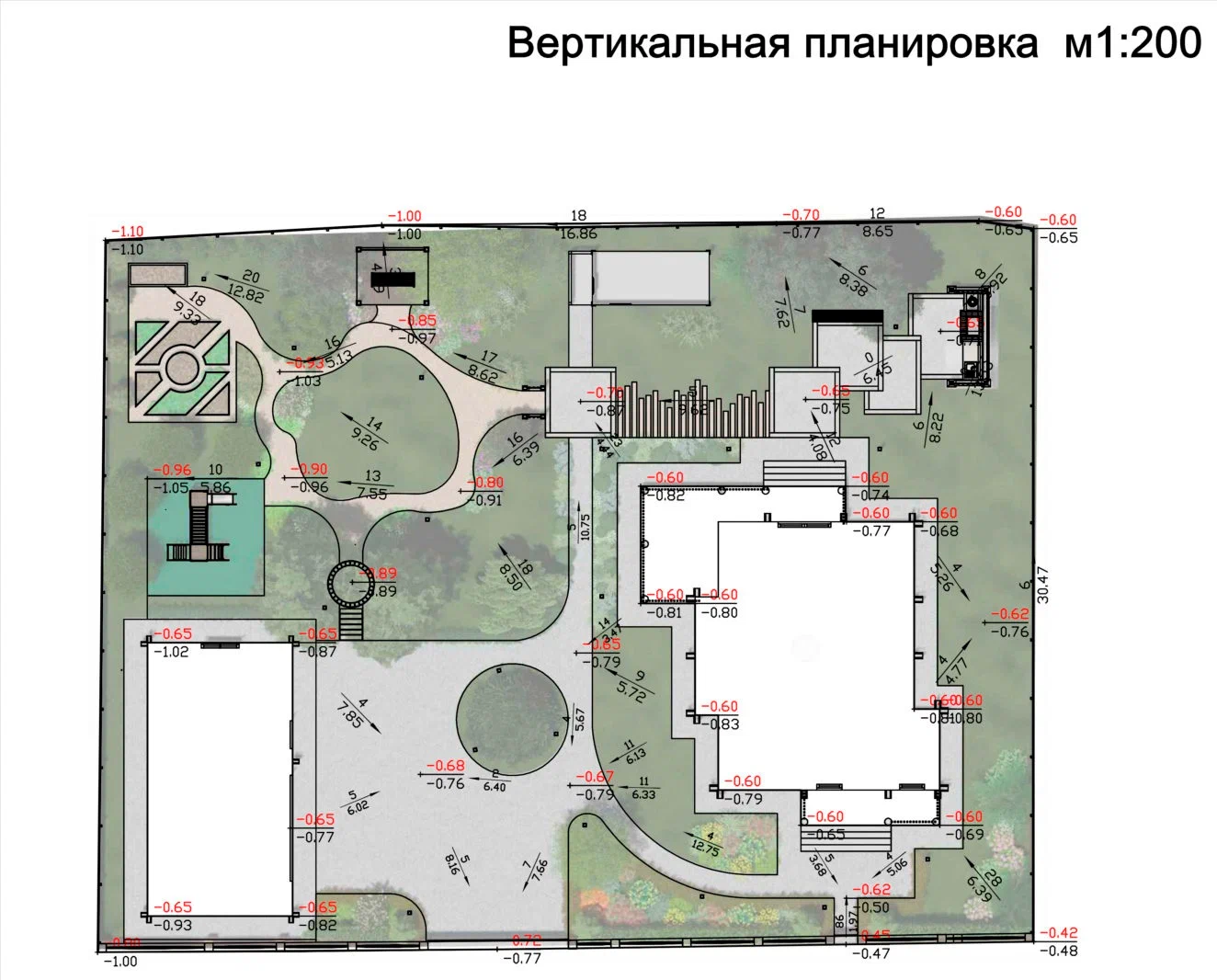 Вертикальная планировка учитывает все элементы будущей застройки. Для зданий задаются проектные отметки чистых полов и отмосток, обеспечивается безопасный уклон от стен и фундаментов. Для дорог, подъездных путей и парковок формируются слои основания с точной геометрией, обеспечиваются плавные сопряжения с существующими покрытиями и въездами. В зонах озеленения создается равномерный рельеф с учетом толщины плодородного слоя, а на склонах предусмотрены террасы, противоэрозионные мероприятия и укрепления. Такой подход позволяет объединить строительные, функциональные и эстетические требования в единую устойчивую систему поверхности.