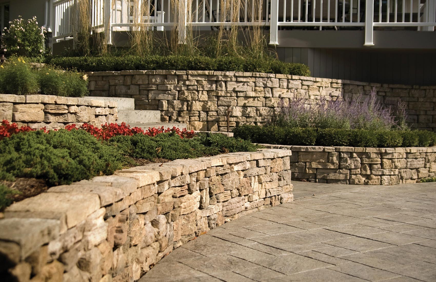 Поверхности подпорных стенок защищаем от влаги и агрессивных сред. Выполняем гидроизоляцию тыльной поверхности битумно-полимерными материалами или проникающими составами, применяем защитные покрытия для лицевой стороны в зависимости от финишной отделки. В качестве облицовки предлагаем архитектурный бетон с фактурной опалубкой, клинкер и керамогранит, искусственный и натуральный камень, габионы с фракционированным наполнителем, а также декоративные блоки с фаской. Решения подбираем так, чтобы они сочетались с дорожным покрытием, лестницами, перилами и озеленением.