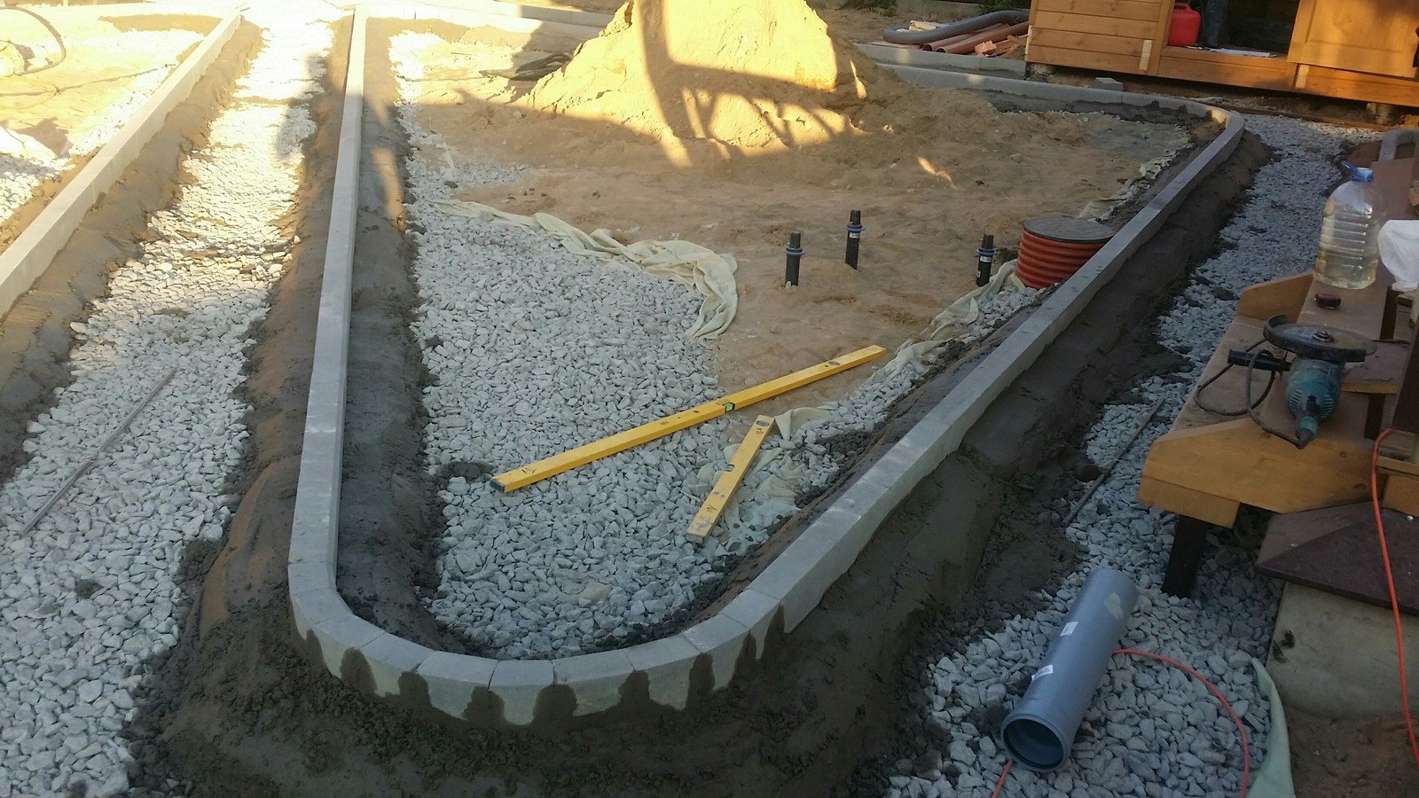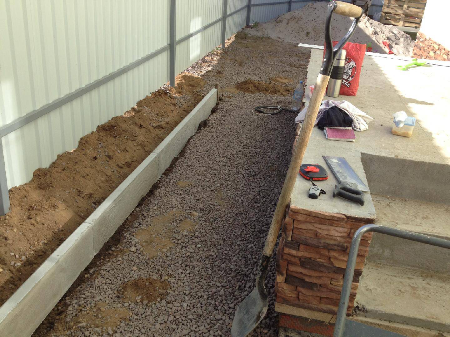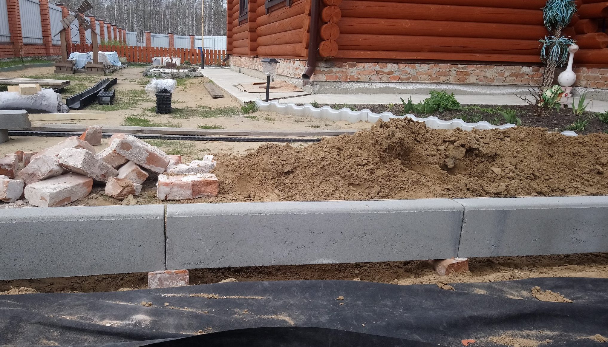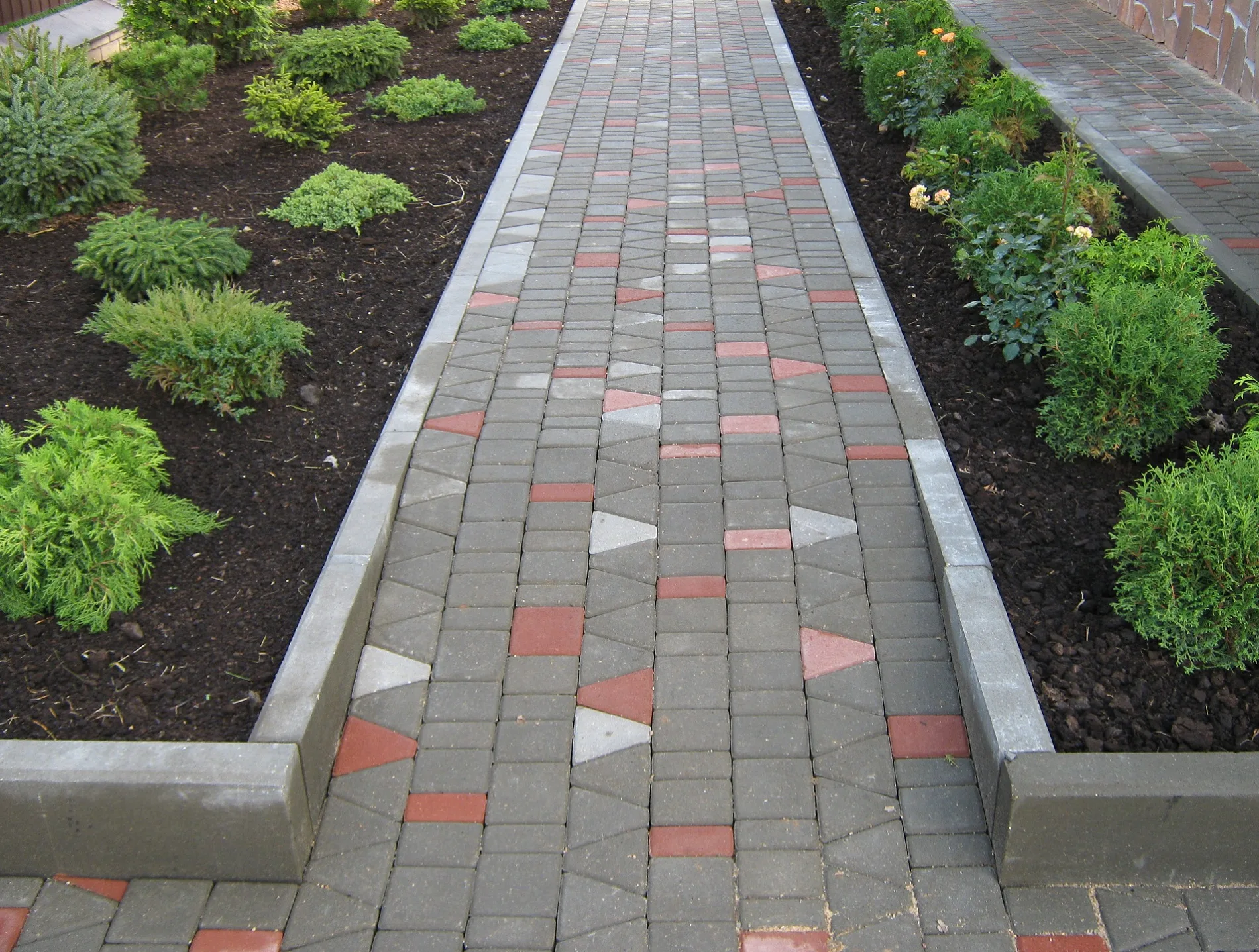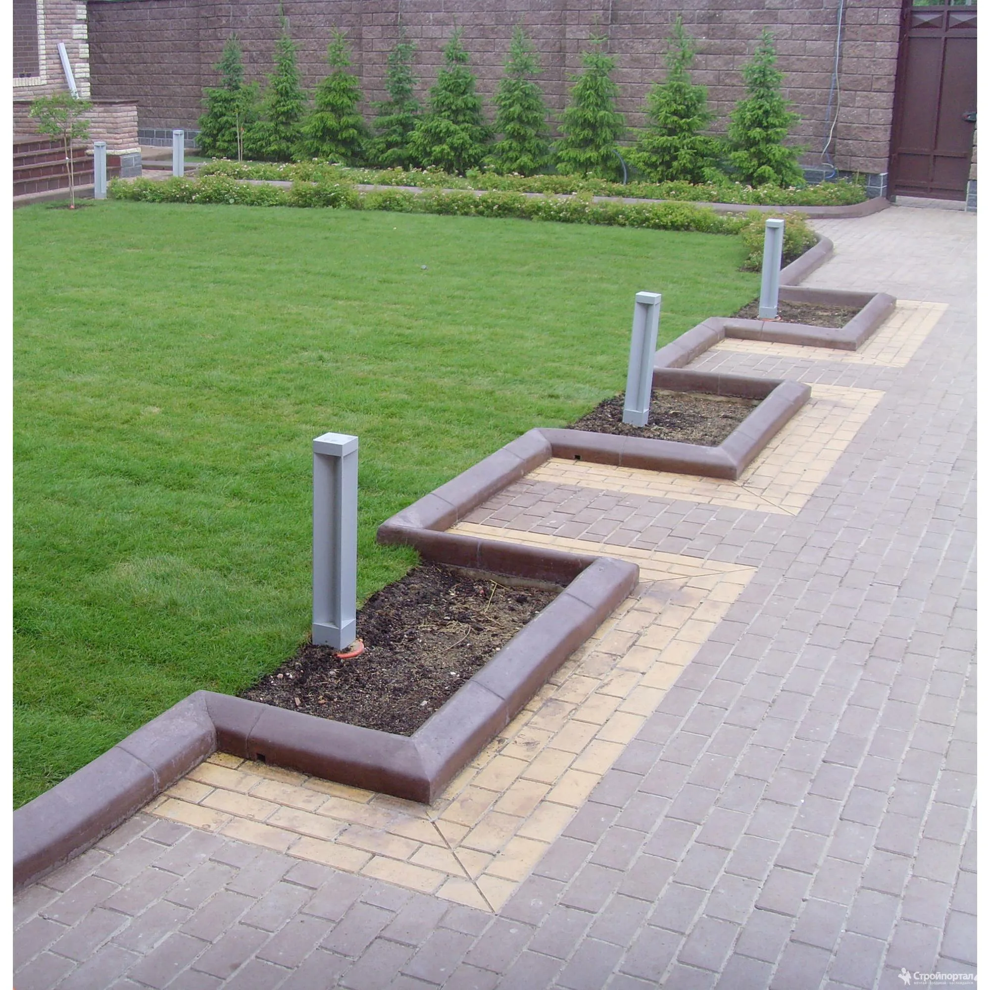Особое внимание уделяем примыканиям. Кромка должна принимать нагрузку от брусчатки или плитки без разрушения и размыва, поэтому зона контакта усиливается правильно подобранной подложкой и фиксирующим слоем, а высоты согласуются с уровнем покрытия с учетом швов, уклонов и водоотводных канавок. Для гравийных и крошечных покрытий предусматриваем скрытые ограничители и бордюрные направляющие, чтобы фракция не выходила за пределы контура, а в местах повышенного увлажнения — локальные дренажные решения, исключающие скопление воды у кромки.