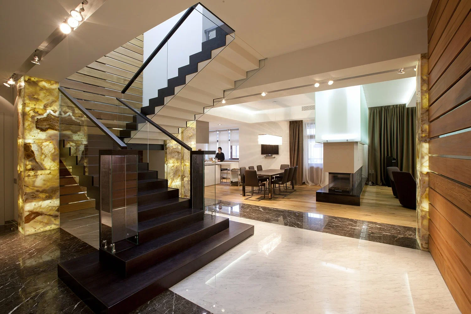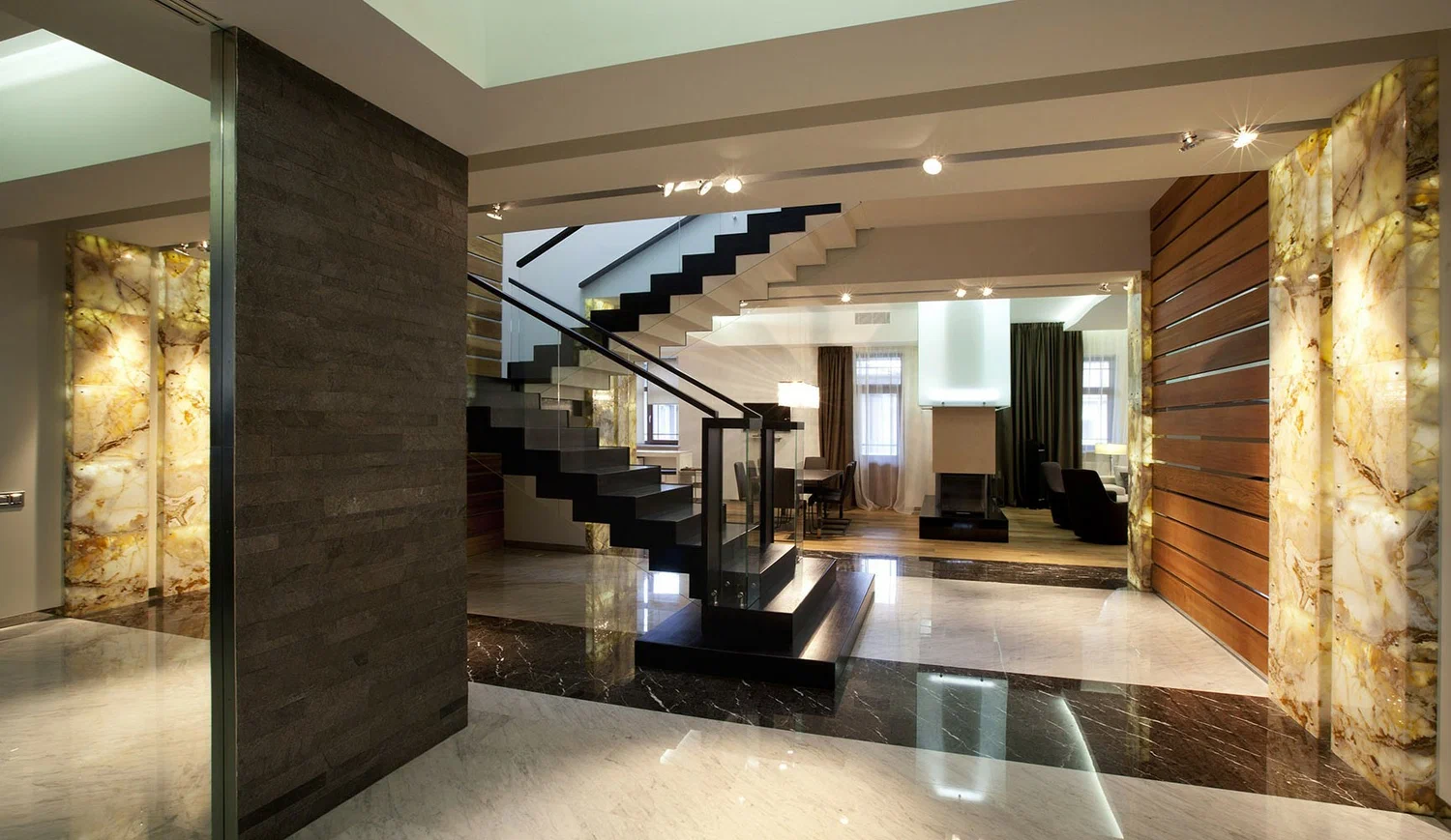 Внутренняя черновая отделка выстраивается с учетом финишных материалов: выравниваем стены и потолки под окраску высокого уровня или декоративные покрытия, подготавливаем основания для крупноформатной плитки и камня, выполняем стяжки полов — классические, полусухие или самонивелирующие — с интеграцией теплых полов и шуморазвязкой. В мокрых зонах выполняем гидроизоляцию с заводом на стены и элементы дренажа, формируем уклоны к трапам и герметизируем все примыкания.