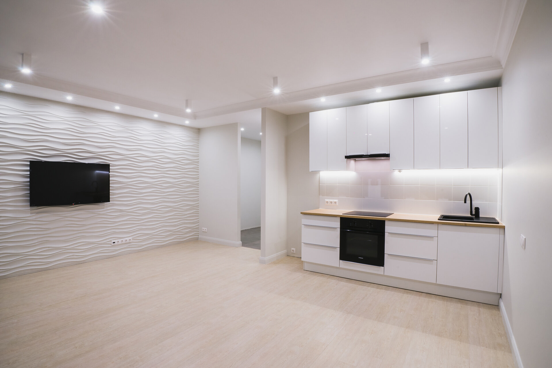 Отделочные работы подчеркивают архитектуру пространства и вводят материалы, устойчивые к повседневной эксплуатации. Ванные и санузлы получают точную раскладку плитки с симметрией швов и аккуратными резами по линиям, усиленные примыкания, герметизацию и правильную посадку сантехнических приборов. На кухне готовится «рабочая» геометрия: уровни и плоскости под гарнитур, влагозащита в зоне фартука, выводы под бытовую технику и освещение рабочей поверхности. В жилых комнатах выполняется покраска или оклейка обоями с чистой стыковкой, создаются ровные плоскости потолков — натяжных или гипсокартонных — с интеграцией световых сценариев. Напольные покрытия подбираются по назначению: кварц-винил и ламинат для устойчивости к износу, инженерная доска и паркет для теплоты и статусности, плитка и керамогранит для функциональных зон с повышенной влажностью. Все деформационные и температурные швы закладываются по технологиям, устраняются паразитные зазоры и «ступеньки», чтобы покрытие выглядело единым и долговечным.