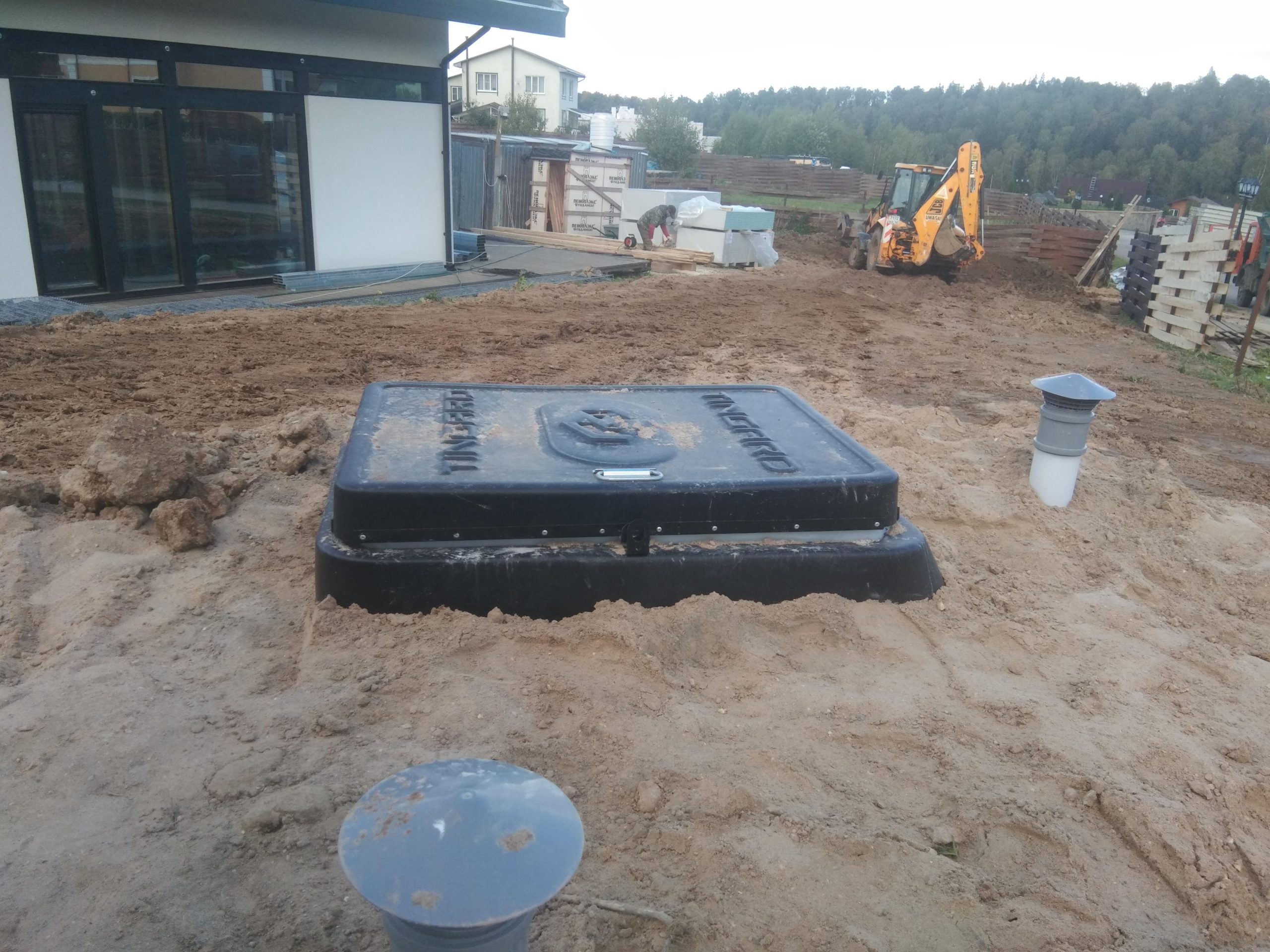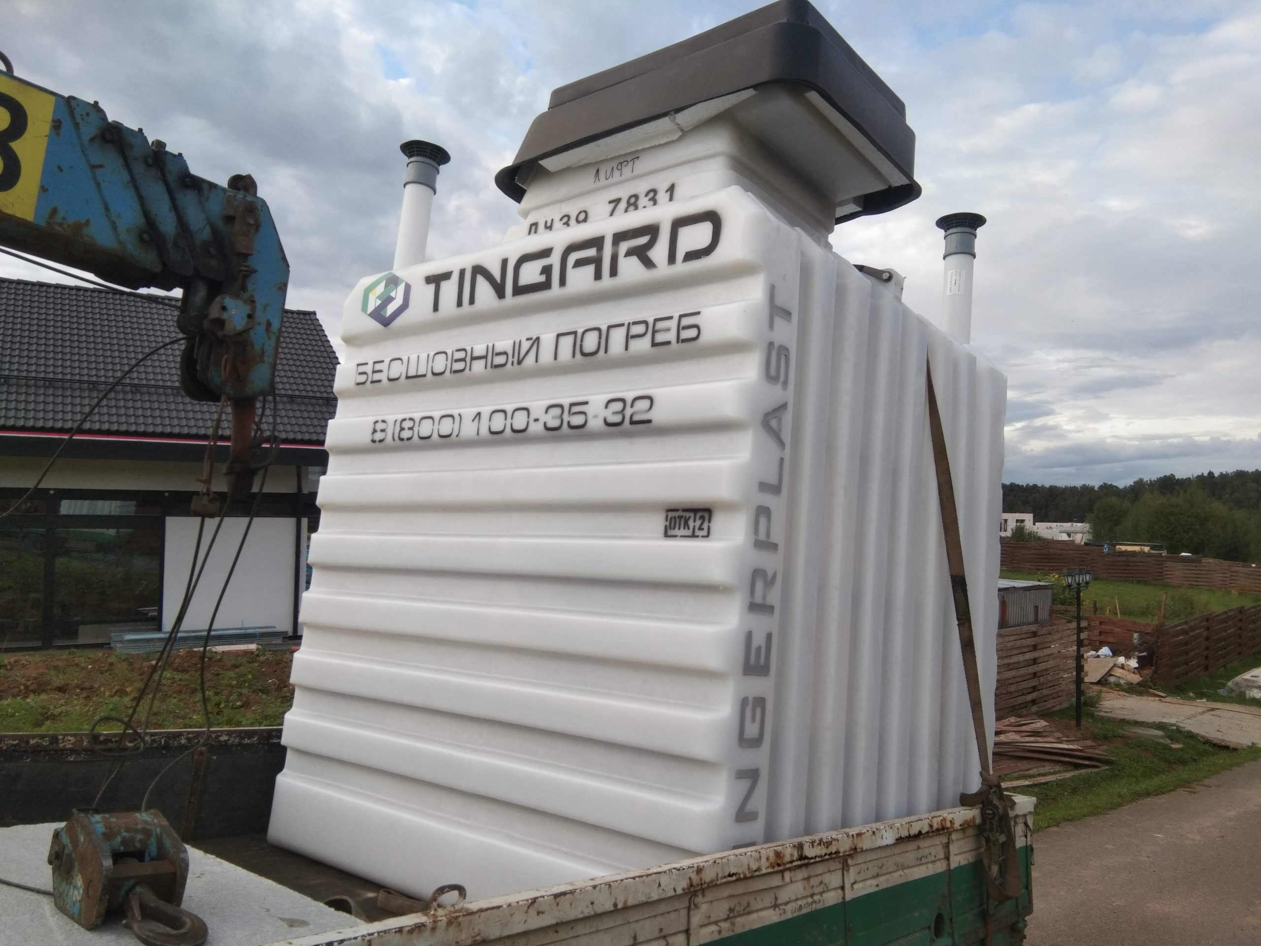 Установлен готовый пластиковый погреб, закапываемый в землю. Конструкция герметична, устойчива к давлению грунта и долговечна. Монтаж выполнен с соблюдением всех строительных и гидроизоляционных норм, что обеспечивает надёжное хранение и защиту содержимого.
